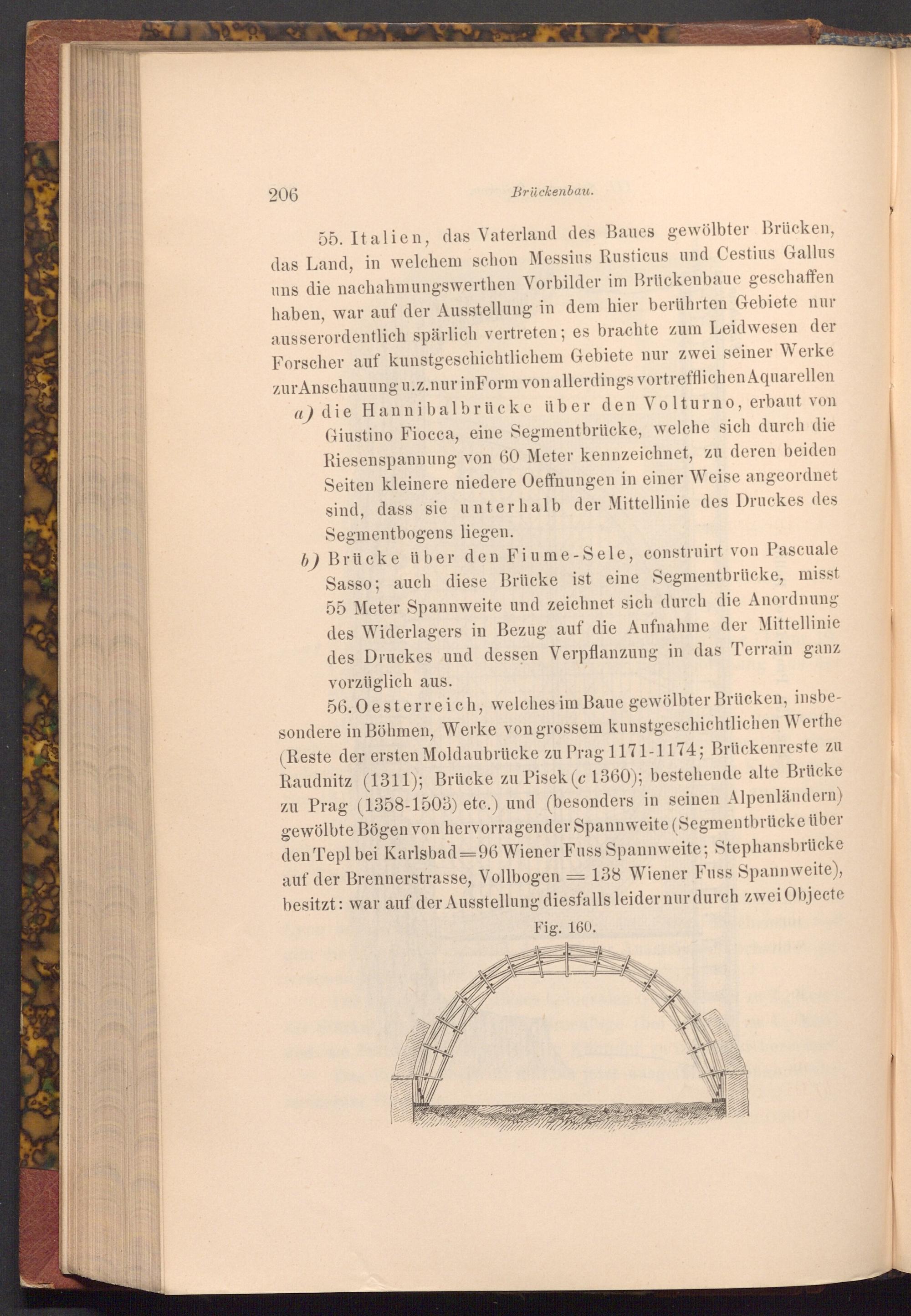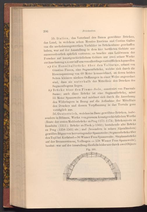 56. Oesterreich, welches im Baue gewölbter Brücken, insbesondere in Böhmen, Werke von grossem kunstgeschichtlichen Werthe ( Reste der ersten Moldaubrücke zu Prag 1171-1174; Brückenreste zu Raudnitz( 1311); Brücke zu Pisek( c 1360); bestehende alte Brücke zu Prag( 1358-1503) etc.) und( besonders in seinen Alpenländern) gewölbte Bögen von hervorragender Spannweite( Segmentbrücke über den Tepl bei Karlsbad= 96 Wiener Fuss Spannweite; Stephansbrücke auf der Brennerstrasse, Vollbogen 138 Wiener Fuss Spannweite), besitzt: war auf der Ausstellung diesfalls leider nur durch zwei Objecte Fig. 160.