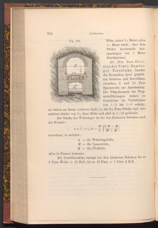 60. Die Bau- Direction der Venlo- Hamburger Eisenbahn brachte die Normalien ihrer gewölbten Brücken und Durchlässe zwischen 3 und 18 Fuss Spannweite zur Anschauung. Die Flügelmauern der Wegunterführungen stehen im Grundrisse im Verhältnisse von 1: 5 bis 1: 6 schräg;