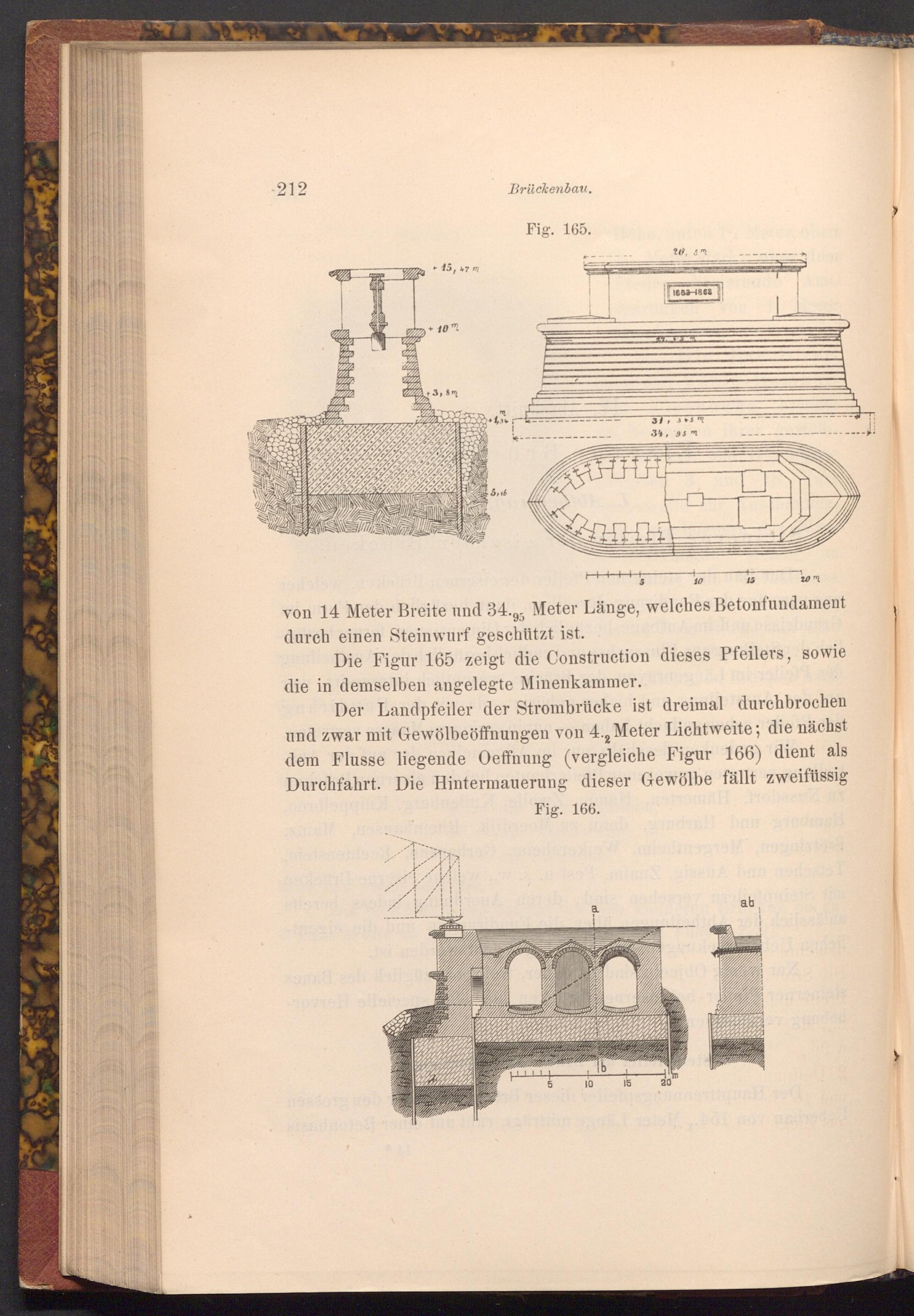 Der Landpfeiler der Strombrücke ist dreimal durchbrochen und zwar mit Gewölbeöffnungen von 4., Meter Lichtweite; die nächst dem Flusse liegende Oeffnung( vergleiche Figur 166) dient als Durchfahrt. Die Hintermauerung dieser Gewölbe fällt zweifüssig Fig. 166.