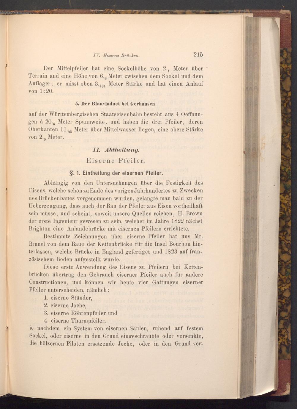 Abhängig von den Untersuchungen über die Festigkeit des Eisens, welche schon zu Ende des vorigen Jahrhundertes zu Zwecken des Brückenbaues vorgenommen wurden, gelangte man bald zu der Ueberzeugung, dass auch der Bau der Pfeiler aus Eisen vortheilhaft sein müsse, und scheint, soweit unsere Quellen reichen, H. Brown der erste Ingenieur gewesen zu sein, welcher im Jahre 1822 nächst Brighton eine Anlandebrücke mit eisernen Pfeilern errichtete.