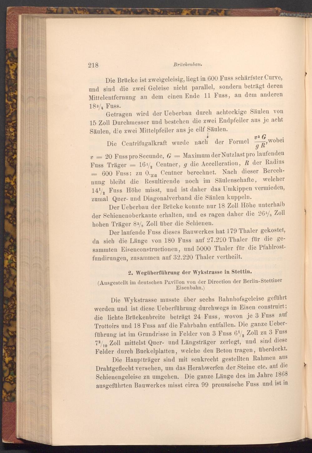 9 R' v= 20 Fuss pro Secunde, G Maximum der Nutzlast pro laufenden Fuss Träger 1612 Centner, g die Accelleration, R der Radius