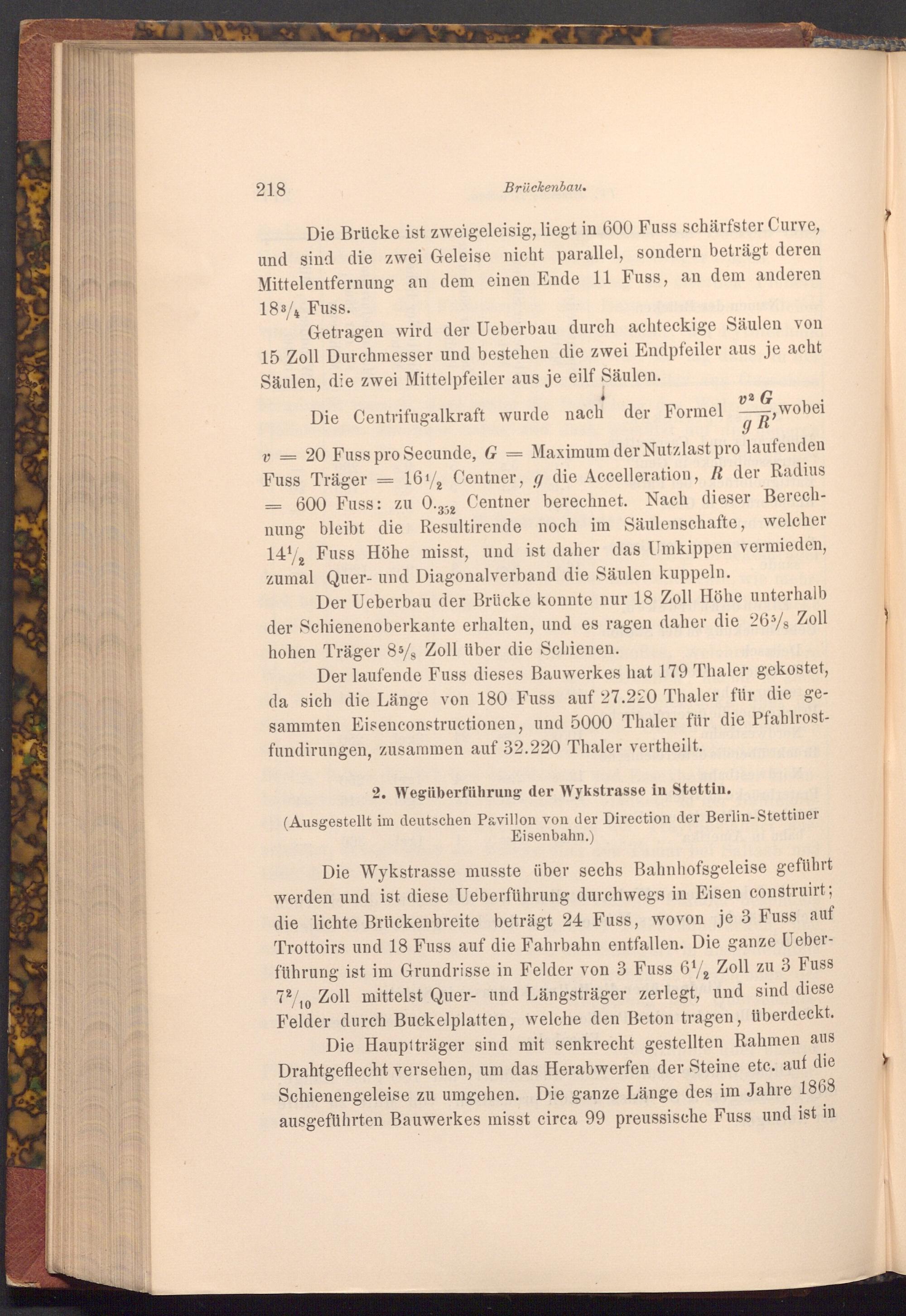 Die Hauptträger sind mit senkrecht gestellten Rahmen aus Drahtgeflecht versehen, um das Herabwerfen der Steine etc. auf die Schienengeleise zu umgehen. Die ganze Länge des im Jahre 1868 ausgeführten Bauwerkes misst circa 99 preussische Fuss und ist in