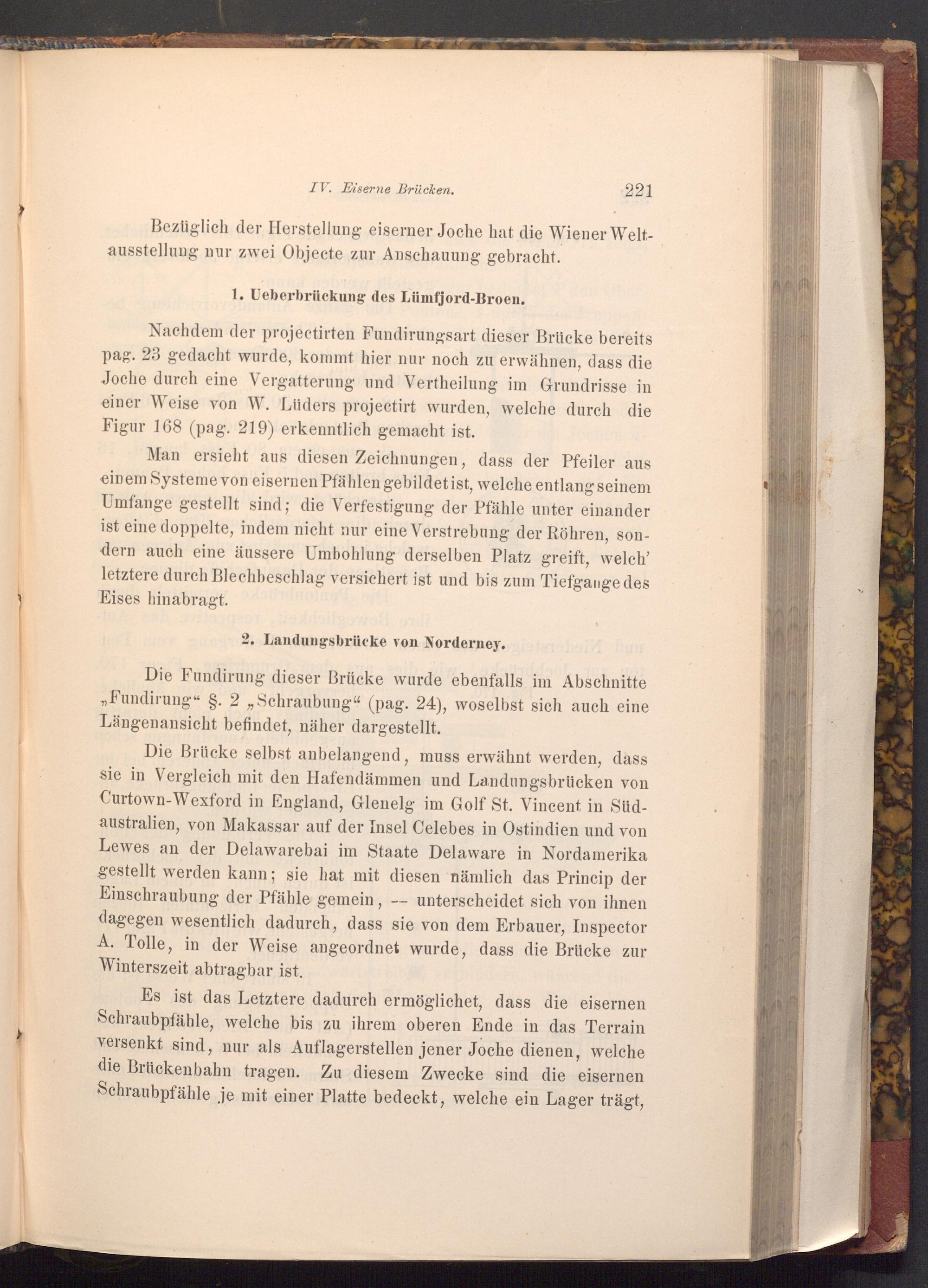Die Brücke selbst anbelangend, muss erwähnt werden, dass sie in Vergleich mit den Hafendämmen und Landungsbrücken von Curtown- Wexford in England, Glenelg im Golf St. Vincent in Südaustralien, von Makassar auf der Insel Celebes in Ostindien und von Lewes an der Delawarebai im Staate Delaware in Nordamerika gestellt werden kann; sie hat mit diesen nämlich das Princip der Einschraubung der Pfähle gemein, unterscheidet sich von ihnen dagegen wesentlich dadurch, dass sie von dem Erbauer, Inspector A. Tolle, in der Weise angeordnet wurde, dass die Brücke zur Winterszeit abtragbar ist.