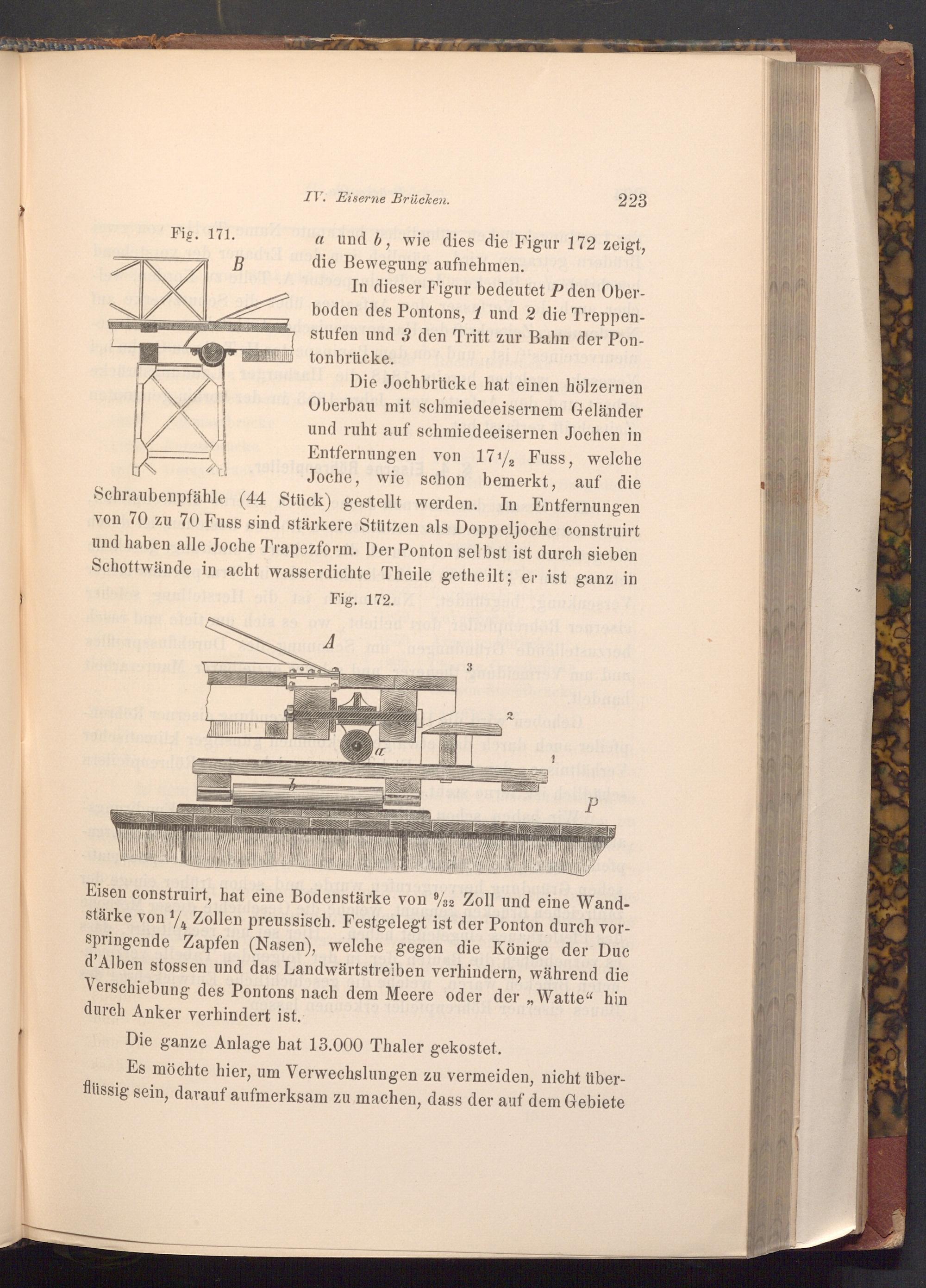 Die Jochbrücke hat einen hölzernen Oberbau mit schmiedeeisernem Geländer und ruht auf schmiedeeisernen Jochen in Entfernungen von 1712 Fuss, welche Joche, wie schon bemerkt, auf die Schraubenpfähle( 44 Stück) gestellt werden. In Entfernungen von 70 zu 70 Fuss sind stärkere Stützen als Doppeljoche construirt und haben alle Joche Trapezform. Der Ponton selbst ist durch sieben Schottwände in acht wasserdichte Theile getheilt; er ist ganz in Fig. 172.