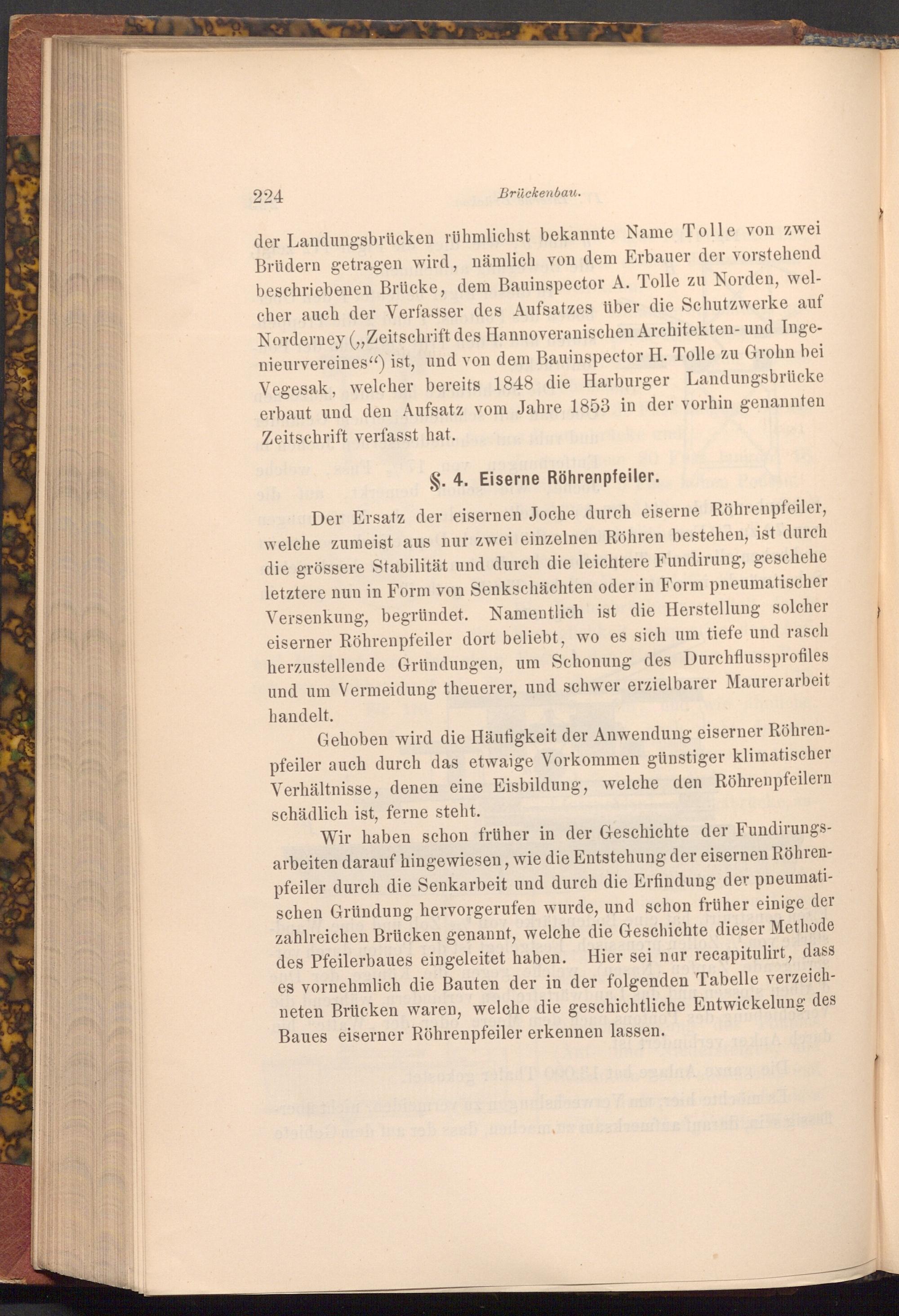 der Landungsbrücken rühmlichst bekannte Name Tolle von zwei Brüdern getragen wird, nämlich von dem Erbauer der vorstehend beschriebenen Brücke, dem Bauinspector A. Tolle zu Norden, welcher auch der Verfasser des Aufsatzes über die Schutzwerke auf Norderney( ,, Zeitschrift des Hannoveranischen Architekten- und Ingenieurvereines") ist, und von dem Bauinspector H. Tolle zu Grohn bei Vegesak, welcher bereits 1848 die Harburger Landungsbrücke erbaut und den Aufsatz vom Jahre 1853 in der vorhin genannten Zeitschrift verfasst hat.