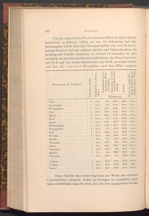 Um den speciellen Pfeilerbau aus Eisen in seinen Kosten beurtheilen zu können, stellen wir aus der bekannten und sehr interessanten Arbeit über den Varrugasviaduct von dem Herrn Ingenieur Pontzen und aus anderen Quellen und Originalnotizen, die nachfolgende Tabelle zusammen, zu welcher zu bemerken ist, dass bezüglich der gleichartigen Kostenvergleichung eine Tonne Gusseisen mit 180 fl. und eine Tonne Schmiedeisen mit 260 fl. gerechnet wurde, und dass die einzelnen Eisenpfeiler nach ihrer Höhe rangiren.
