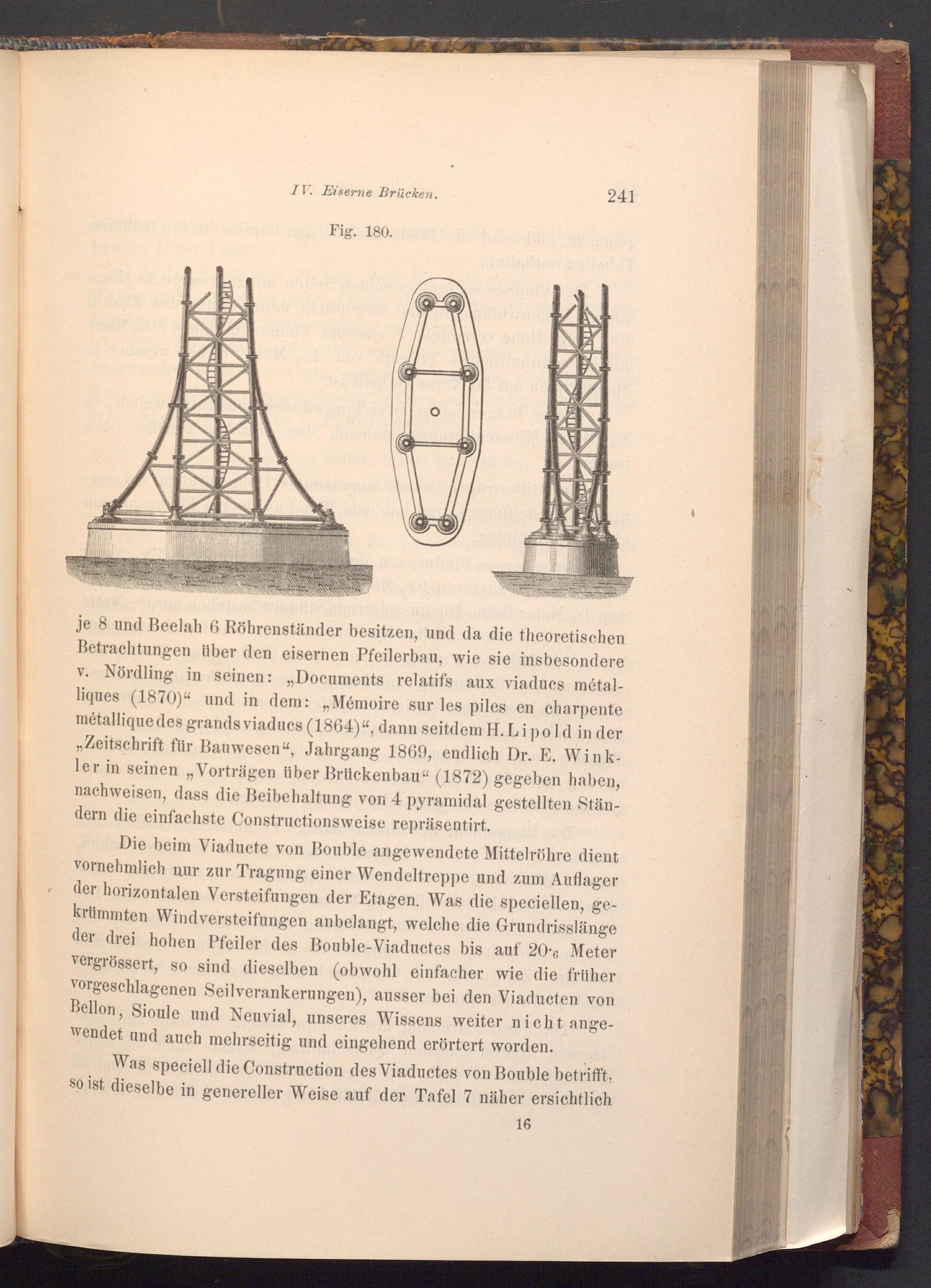 je 8 und Beelah 6 Röhrenständer besitzen, und da die theoretischen Betrachtungen über den eisernen Pfeilerbau, wie sie insbesondere v. Nördling in seinen:„ Documents relatifs aux viadues métalliques( 1870)" und in dem:„ Mémoire sur les piles en charpente métallique des grands viaducs( 1864)", dann seitdem H. Lipold in der ,, Zeitschrift für Bauwesen", Jahrgang 1869, endlich Dr. E. Winkler in seinen„, Vorträgen über Brückenbau"( 1872) gegeben haben, nachweisen, dass die Beibehaltung von 4 pyramidal gestellten Ständern die einfachste Constructionsweise repräsentirt.