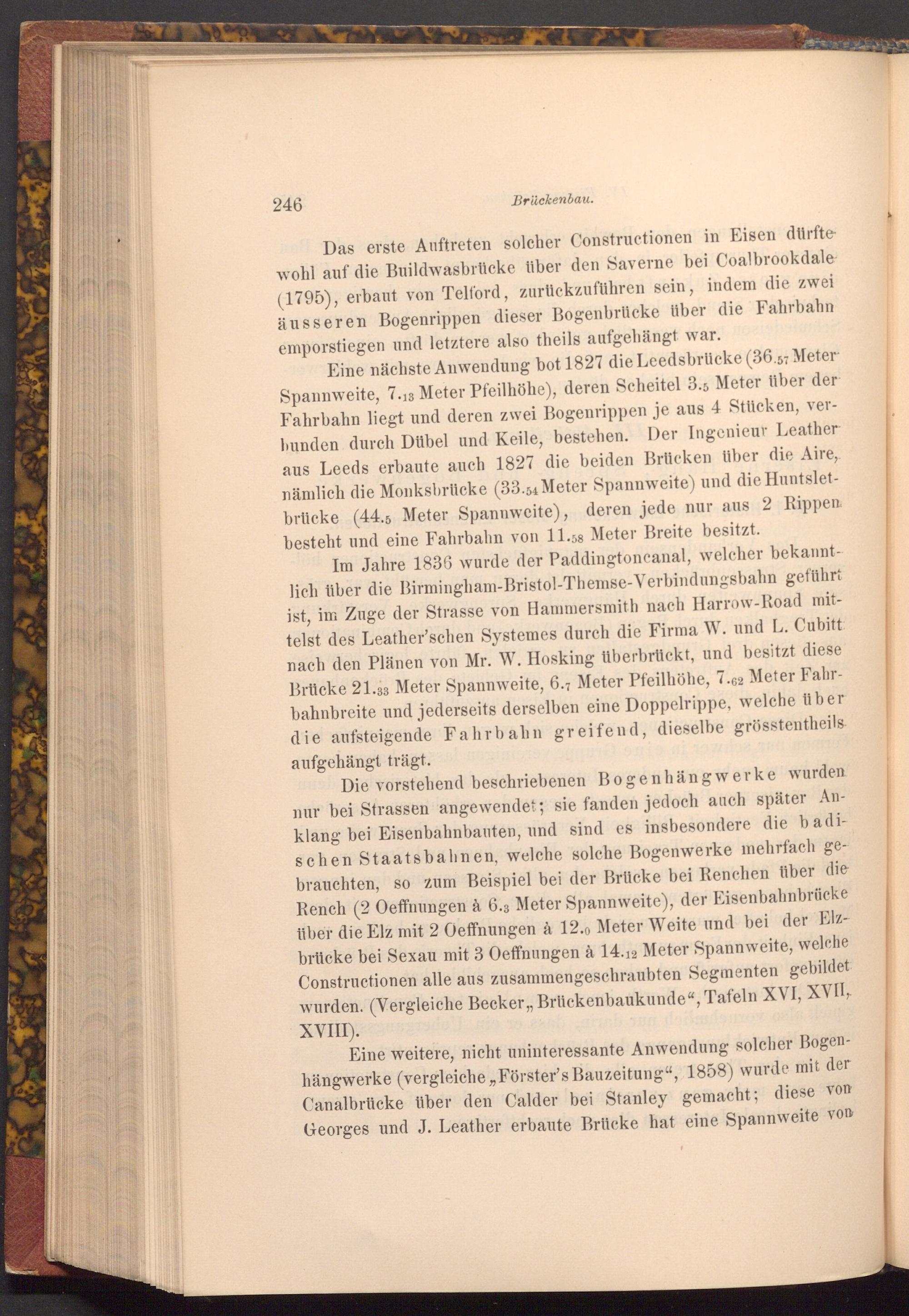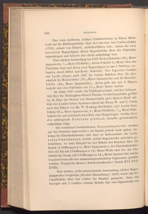 Im Jahre 1836 wurde der Paddingtoncanal, welcher bekanntlich über die Birmingham- Bristol- Themse- Verbindungsbahn geführt ist, im Zuge der Strasse von Hammersmith nach Harrow- Road mittelst des Leather'schen Systemes durch die Firma W. und L. Cubitt: nach den Plänen von Mr. W. Hosking überbrückt, und besitzt diese Brücke 21.33 Meter Spannweite, 6.7 Meter Pfeilhöhe, 7.62 Meter Fahrbahnbreite und jederseits derselben eine Doppelrippe, welche über die aufsteigende Fahrbahn greifend, dieselbe grösstentheils aufgehängt trägt.