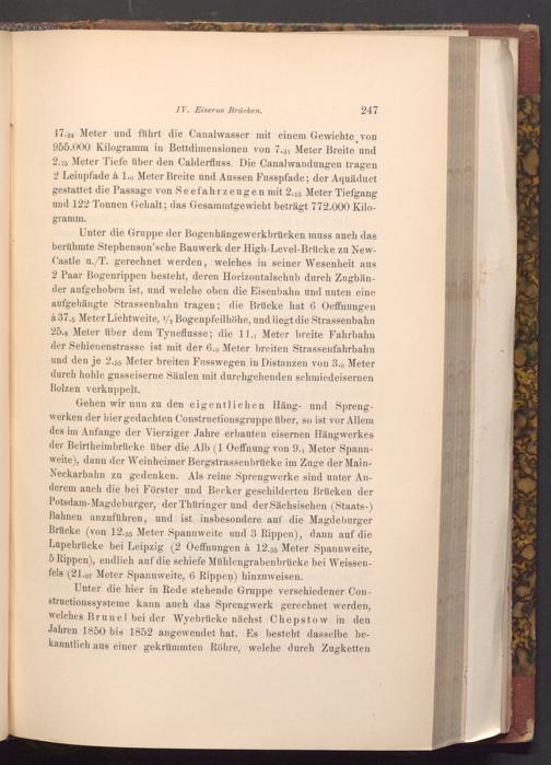 Unter die Gruppe der Bogenhängewerkbrücken muss auch das berühmte Stephenson'sche Bauwerk der High- Level- Brücke zu NewCastle u./T. gerechnet werden, welches in seiner Wesenheit aus 2 Paar Bogenrippen besteht, deren Horizontalschub durch Zugbänder aufgehoben ist, und welche oben die Eisenbahn und unten eine aufgehängte Strassenbahn tragen; die Brücke hat 6 Oeffnungen à 37.5 Meter Lichtweite, 1/, Bogenpfeilhöhe, und liegt die Strassenbahn 25.8 Meter über dem Tyneflusse; die 11.1 Meter breite Fahrbahn der Schienenstrasse ist mit der 6.0 Meter breiten Strassenfahrbahn und den je 2.55 Meter breiten Fusswegen in Distanzen von 3.0 Meter durch hohle gusseiserne Säulen mit durchgehenden schmiedeisernen Bolzen verkuppelt.