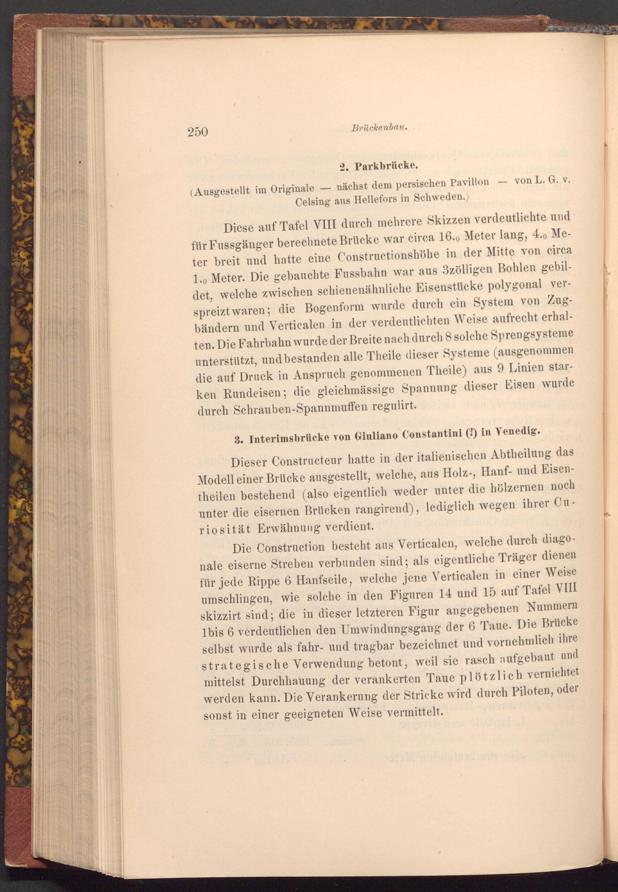 Diese auf Tafel VIII durch mehrere Skizzen verdeutlichte und für Fussgänger berechnete Brücke war circa 16.0 Meter lang, 4.0 Meter breit und hatte eine Constructionshöhe in der Mitte von circa 1.0 Meter. Die gebauchte Fussbahn war aus 3zölligen Bohlen gebildet, welche zwischen schienenähnliche Eisenstücke polygonal verspreizt waren; die Bogenform wurde durch ein System von Zugbändern und Verticalen in der verdeutlichten Weise aufrecht erhalten. Die Fahrbahn wurde der Breite nach durch 8 solche Sprengsysteme unterstützt, und bestanden alle Theile dieser Systeme( ausgenommen die auf Druck in Anspruch genommenen Theile) aus 9 Linien starken Rundeisen; die gleichmässige Spannung dieser Eisen wurde durch Schrauben- Spannmuffen regulirt.