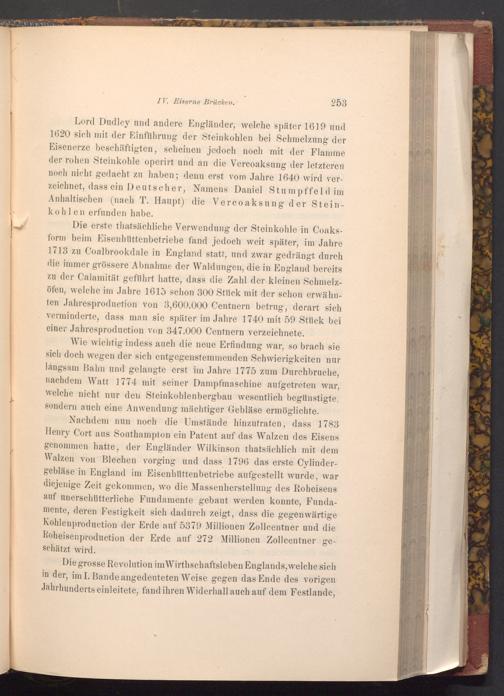 Nachdem nun noch die Umstände hinzutraten, dass 1783 Henry Cort aus Southampton ein Patent auf das Walzen des Eisens genommen hatte, der Engländer Wilkinson thatsächlich mit dem Walzen von Blechen vorging und dass 1796 das erste Cylindergebläse in England im Eisenhüttenbetriebe aufgestellt wurde, war diejenige Zeit gekommen, wo die Massenherstellung des Roheisens auf unerschütterliche Fundamente gebaut werden konnte, Fundamente, deren Festigkeit sich dadurch zeigt, dass die gegenwärtige Kohlenproduction der Erde auf 5379 Millionen Zollcentner und die Roheisenproduction der Erde auf 272 Millionen Zollcentner ge