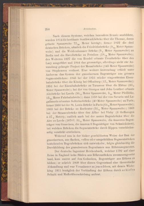 Nach diesem Systeme, welches besonders Rennie ausbildete, wurden 1814 die berühmte Southwark brücke über die Themse, deren grösste Spannweite 72.9 Meter beträgt; ferner 1822 die drei deutschen Brücken, nämlich die Friedrichsbrücke( 9.1 Meter Spannweite) und die Weidendammer Brücke( 9., Meter Spannweite) zu Berlin und die Havelbrücke zu Potsdam( 18.2 Meter Spannweite); des Weiteren 1827 die von Rendel erbaute Trentbrücke über den Lary ausgeführt und 1844 das grossartige, allerdings nicht zur Anwendung gelangte Project der Menaibrücke( 145 Meter Spannweite) von Stephenson verfasst. Eine weitere Anwendung erhielt unter Anderem das System der gusseisernen Bogenträger aus grossen Segmentstücken: 1843 bei der 1851 wieder eingestürzten Eisenbahnbrücke über die Kinzig bei Offenburg( 12., Meter Spannweite); 1851 bei der Eisenbahnbrücke zu Tarascon über die Rhône( 60.0 Meter Spannweite); bei der von Georges und John Leather erbaute Airebrücke bei Leeds( 36., Meter Spannweite, 3.5 Meter Pfeilhöhe, 13.25 Meter Fahrbahnbreite); dann 1858 bei der von Savarin und Lagalisserie erbauten Solferinobrücke( 40 Meter Spannweite) zu Paris; ferner 1860 bei der St. Louis- Brücke in Paris( 64., Meter Spannweite); 1863 bei der Brücke zu Rochester( 51., Meter Spannweite); 1868 bei der Strassenbrücke über den Allier bei Vichy( 6 Oeffnungen à 37., Meter); endlich auch bei der neuen Bogenbrücke über die Aire zu Leeds( 1870?, 31., Meter Spannweite, die äusseren Bogenträger von Gusseisen, die inneren 8 Bogenträger von Schmiedeisen), bei welchen Brücken die Segmentstücke durch Rippen verschiedenartig verstärkt erscheinen. lomandos, 2001-200 oldod neisp