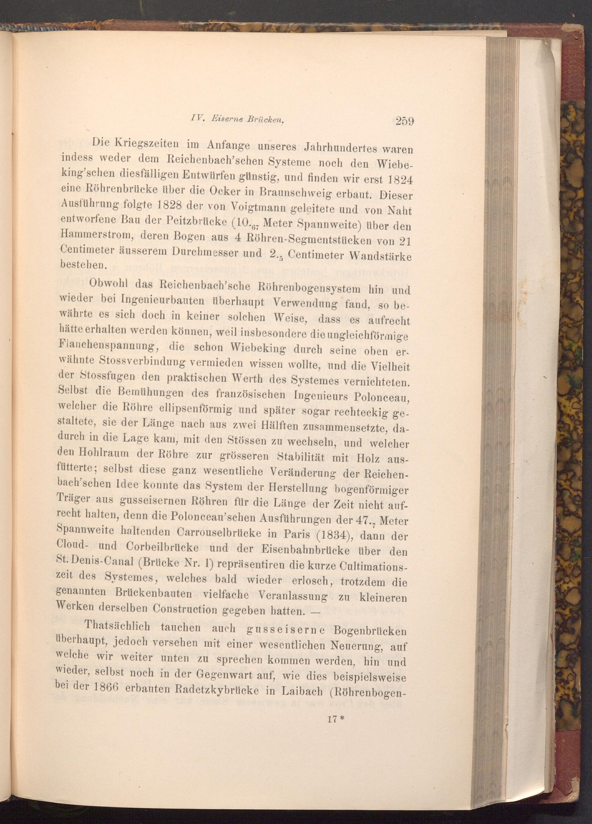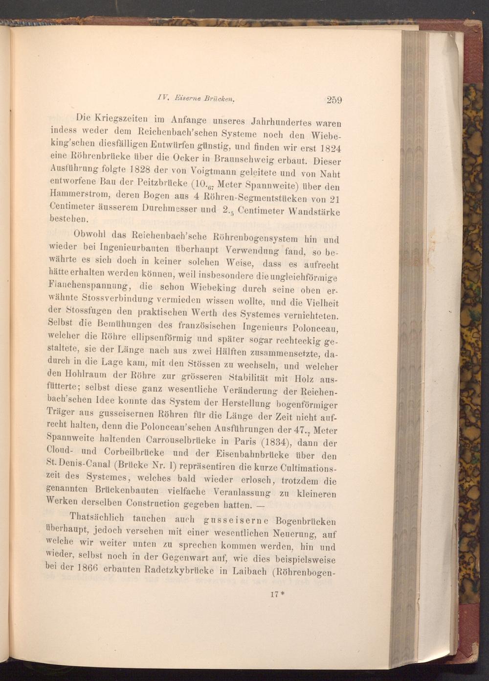 Thatsächlich tauchen auch gusseiserne Bogenbrücken überhaupt, jedoch versehen mit einer wesentlichen Neuerung, auf welche wir weiter unten zu sprechen kommen werden, hin und wieder, selbst noch in der Gegenwart auf, wie dies beispielsweise bei der 1866 erbauten Radetzkybrücke in Laibach( Röhrenbogen