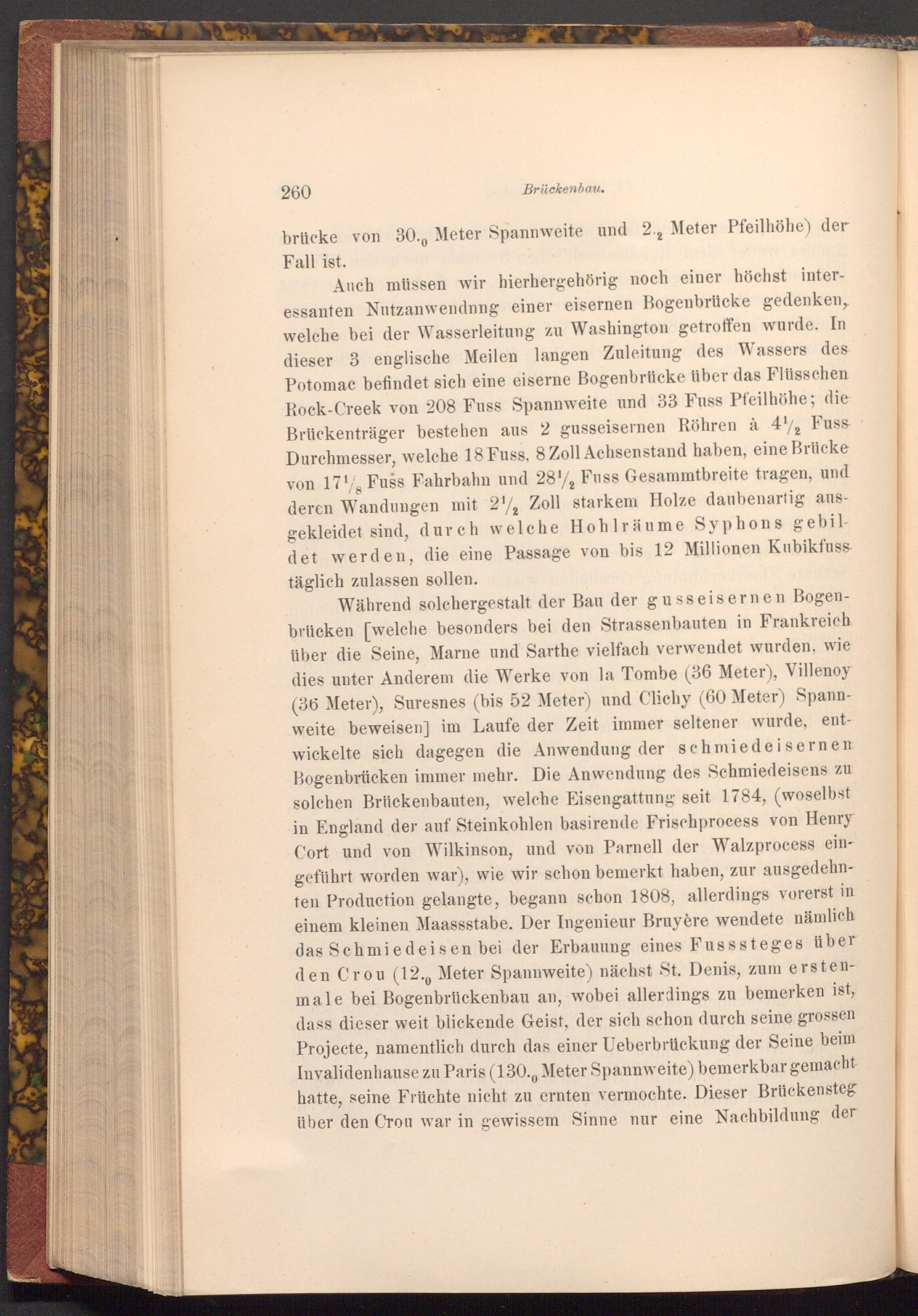 Während solchergestalt der Bau der gusseisernen Bogenbrücken[ welche besonders bei den Strassenbauten in Frankreich über die Seine, Marne und Sarthe vielfach verwendet wurden, wie dies unter Anderem die Werke von la Tombe( 36 Meter), Villenoy ( 36 Meter), Suresnes( bis 52 Meter) und Clichy( 60 Meter) Spannweite beweisen] im Laufe der Zeit immer seltener wurde, entwickelte sich dagegen die Anwendung der schmiedeisernen Bogenbrücken immer mehr. Die Anwendung des Schmiedeisens zu solchen Brückenbauten, welche Eisengattung seit 1784,( woselbst in England der auf Steinkohlen basirende Frischprocess von Henry Cort und von Wilkinson, und von Parnell der Walzprocess eingeführt worden war), wie wir schon bemerkt haben, zur ausgedehnten Production gelangte, begann schon 1808, allerdings vorerst in einem kleinen Maassstabe. Der Ingenieur Bruyère wendete nämlich das Schmiedeisen bei der Erbauung eines Fusssteges über den Crou( 12., Meter Spannweite) nächst St. Denis, zum erstenmale bei Bogenbrückenbau an, wobei allerdings zu bemerken ist, dass dieser weit blickende Geist, der sich schon durch seine grossen Projecte, namentlich durch das einer Ueberbrückung der Seine beim Invalidenhause zu Paris( 130., Meter Spannweite) bemerkbar gemacht hatte, seine Früchte nicht zu ernten vermochte. Dieser Brückensteg über den Crou war in gewissem Sinne nur eine Nachbildung der