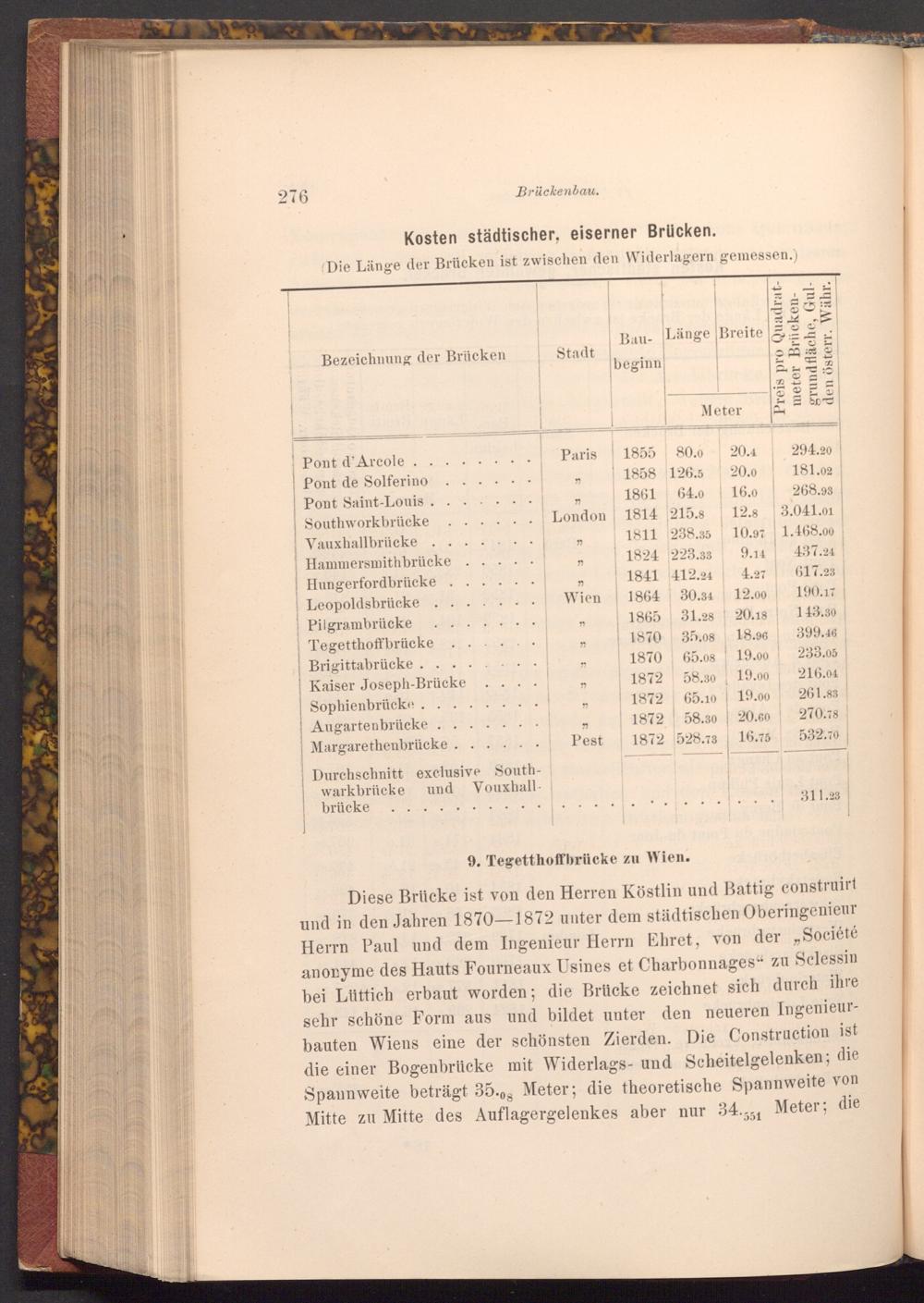 Diese Brücke ist von den Herren Köstlin und Battig construirt und in den Jahren 1870-1872 unter dem städtischen Oberingenieur Herrn Paul und dem Ingenieur Herrn Ehret, von der„ Société anonyme des Hauts Fourneaux Usines et Charbonnages" zu Sclessin bei Lüttich erbaut worden; die Brücke zeichnet sich durch ihre sehr schöne Form aus und bildet unter den neueren Ingenieurbauten Wiens eine der schönsten Zierden. Die Construction ist die einer Bogenbrücke mit Widerlags- und Schéitelgelenken; die Spannweite beträgt 35.8 Meter; die theoretische Spannweite von Mitte zu Mitte des Auflagergelenkes aber nur 34.51 Meter; die