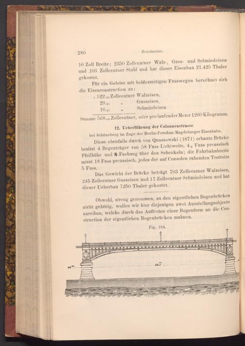 bei Schöneberg im Zuge der Berlin- Potsdam- Magdeburger Eisenbahn. Diese ebenfalls durch von Quassowski( 1871) erbaute Brücke besitzt 4 Bogenträger von 58 Fuss Lichtweite, 4., Fuss preussisch Pfeilhöhe und N- Fachung über den Schenkeln; die Fahrbahnbreite misst 18 Fuss preussisch, jedes der auf Consolen ruhenden Trottoirs 5 Fuss.