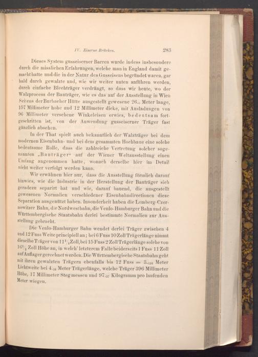Die Venlo- Hamburger Bahn wendet derlei Träger zwischen 4 und 12 Fuss Weite principiell an; bei 6 Fuss 10 Zoll Trägerlänge nimmt dieselbe Träger von 111, Zoll, bei 15 Fuss 2 Zoll Trägerlänge solche von 161 Zoll Höhe an, in welch' letzterem Falle beiderseits 1 Fuss 11 Zoll auf Auflager gerechnet werden. Die Württembergische Staatsbahn geht mit ihren gewalzten Trägern ebenfalls bis 12 Fuss 3.438 Meter Lichtweite bei 4.24 Meter Trägerlänge, welche Träger 396 Millimeter Höhe, 17 Millimeter Steg messen und 97.27 Kilogramm pro laufenden Meter wiegen.