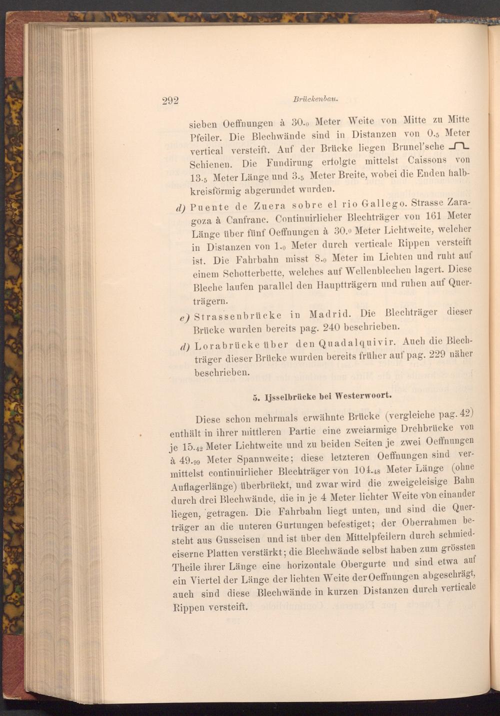 d) Puente de Zuera sobre el rio Gallego. Strasse Zaragoza à Canfranc. Continuirlicher Blechträger von 161 Meter Länge über fünf Oeffnungen à 30.0 Meter Lichtweite, welcher in Distanzen von 1.0 Meter durch verticale Rippen versteift ist. Die Fahrbahn misst 8.0 Meter im Lichten und ruht auf einem Schotterbette, welches auf Wellenblechen lagert. Diese Bleche laufen parallel den Hauptträgern und ruhen auf Querträgern.