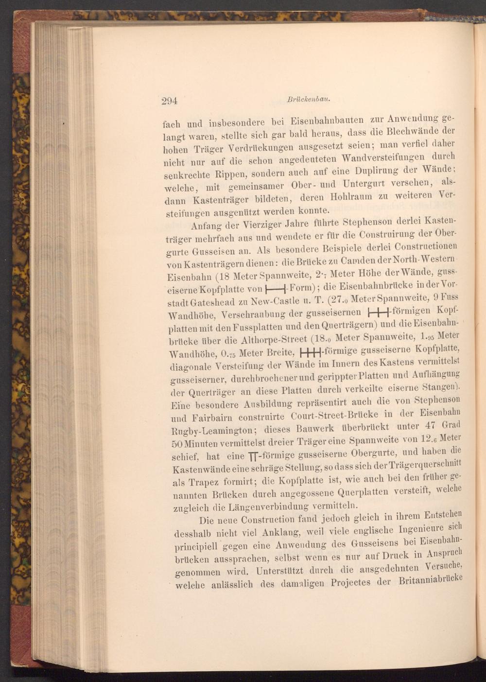 Anfang der Vierziger Jahre führte Stephenson derlei Kastenträger mehrfach aus und wendete er für die Construirung der Obergurte Gusseisen an. Als besondere Beispiele derlei Constructionen von Kastenträgern dienen: die Brücke zu Camden der North- Western Eisenbahn( 18 Meter Spannweite, 27 Meter Höhe der Wände, gusseiserne Kopfplatte von Form); die Eisenbahnbrücke in der Vorstadt Gateshead zu New- Castle u. T.( 27.0 Meter Spannweite, 9 Fuss Wandhöhe, Verschraubung der gusseisernen H- förmigen Kopfplatten mit den Fussplatten und den Querträgern) und die Eisenbahnbrücke über die Althorpe- Street( 18.0 Meter Spannweite, 1.95 Meter Wandhöhe, 0.75 Meter Breite, HH- förmige gusseiserne Kopfplatte, diagonale Versteifung der Wände im Innern des Kastens vermittelst gusseiserner, durchbrochener und gerippter Platten und Aufhängung der Querträger an diese Platten durch verkeilte eiserne Stangen). Eine besondere Ausbildung repräsentirt auch die von Stephenson und Fairbairn construirte Court- Street- Brücke in der Eisenbahn Rugby- Leamington; dieses Bauwerk überbrückt unter 47 Grad 50 Minuten vermittelst dreier Träger eine Spannweite von 12.6 Meter schief, hat eine TT- förmige gusseiserne Obergurte, und haben die Kastenwände eine schräge Stellung, so dass sich der Trägerquerschnitt als Trapez formirt; die Kopfplatte ist, wie auch bei den früher genannten Brücken durch angegossene Querplatten versteift, welche zugleich die Längenverbindung vermitteln.