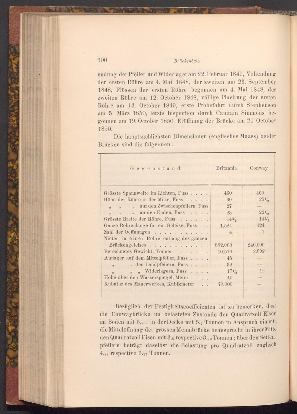 endung der Pfeiler und Widerlager am 22. Februar 1849, Vollendung der ersten Röhre am 4. Mai 1848, der zweiten am 23. September 1848, Flössen der ersten Röhre begonnen am 4. Mai 1848, der zweiten Röhre am 12. October 1848, völlige Placirung der ersten Röhre am 13. October 1849, erste Probefahrt durch Stephenson am 5. März 1850, letzte Inspection durch Capitain Simmons begonnen am 19. October 1850, Eröffnung der Brücke am 21. October 1850.