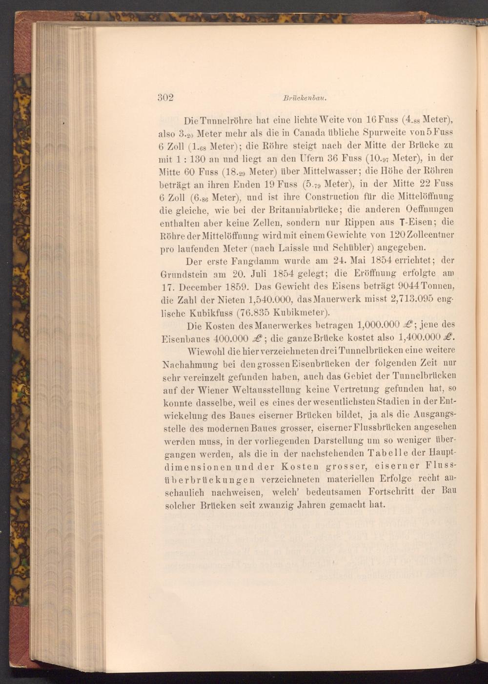 Wiewohl die hier verzeichneten drei Tunnelbrücken eine weitere Nachahmung bei den grossen Eisenbrücken der folgenden Zeit nur sehr vereinzelt gefunden haben, auch das Gebiet der Tunnelbrücken auf der Wiener Weltausstellung keine Vertretung gefunden hat, so konnte dasselbe, weil es eines der wesentlichsten Stadien in der Entwickelung des Baues eiserner Brücken bildet, ja als die Ausgangsstelle des modernen Baues grosser, eiserner Flussbrücken angesehen werden muss, in der vorliegenden Darstellung um so weniger übergangen werden, als die in der nachstehenden Tabelle der Hauptdimensionen und der Kosten grosser, eiserner Flussüberbrückungen verzeichneten materiellen Erfolge recht anschaulich nachweisen, welch' bedeutsamen Fortschritt der Bau solcher Brücken seit zwanzig Jahren gemacht hat.