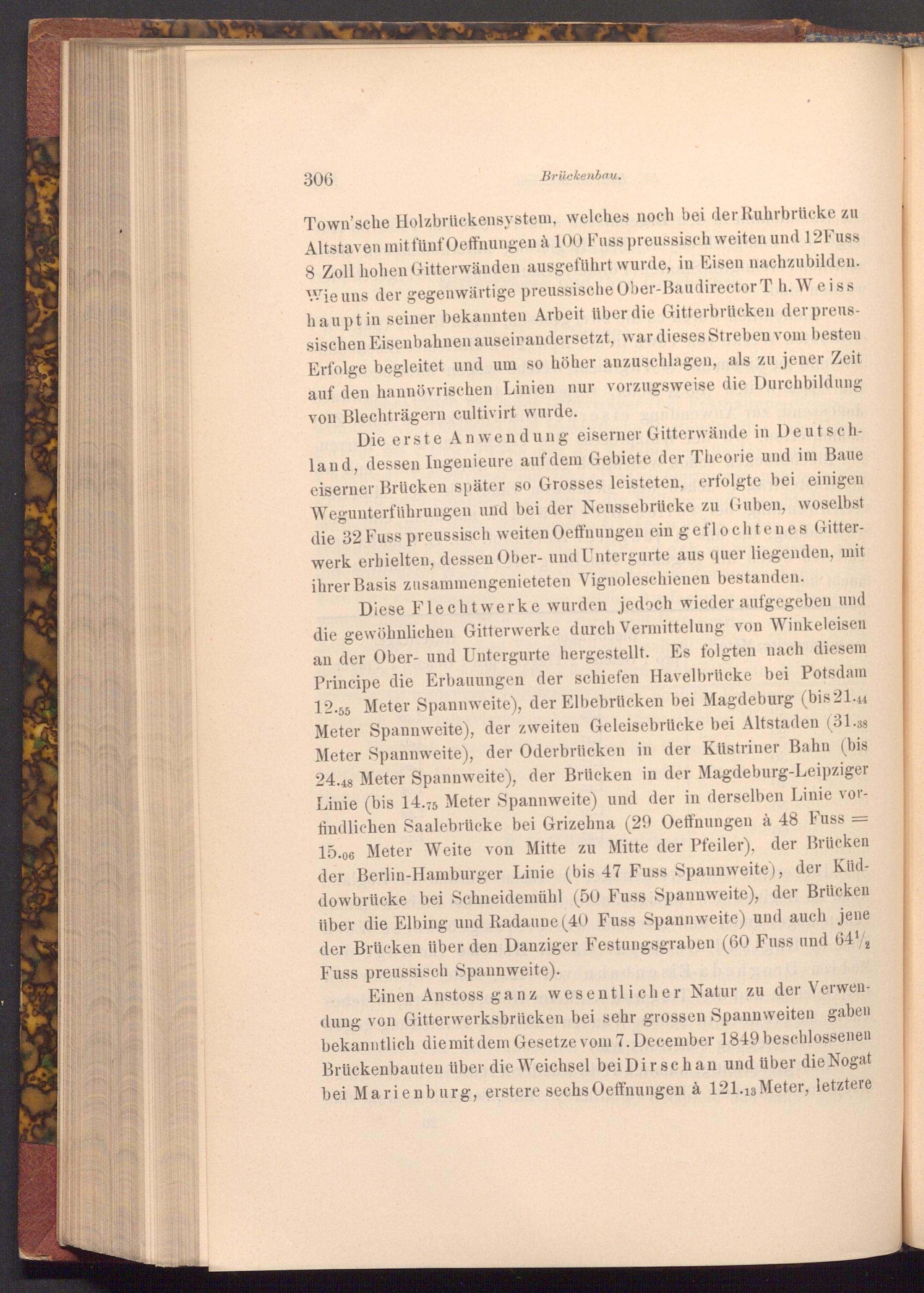 Diese Flechtwerke wurden jedoch wieder aufgegeben und die gewöhnlichen Gitterwerke durch Vermittelung von Winkeleisen an der Ober- und Untergurte hergestellt. Es folgten nach diesem Principe die Erbauungen der schiefen Havelbrücke bei Potsdam 12.55 Meter Spannweite), der Elbebrücken bei Magdeburg( bis 21.44 Meter Spannweite), der zweiten Geleisebrücke bei Altstaden( 31.38 Meter Spannweite), der Oderbrücken in der Küstriner Bahn( bis 24.48 Meter Spannweite), der Brücken in der Magdeburg- Leipziger Linie( bis 14.75 Meter Spannweite) und der in derselben Linie vorfindlichen Saalebrücke bei Grizehna( 29 Oeffnungen à 48 Fuss 15.06 Meter Weite von Mitte zu Mitte der Pfeiler), der Brücken der Berlin- Hamburger Linie( bis 47 Fuss Spannweite), der Küddowbrücke bei Schneidemühl( 50 Fuss Spannweite), der Brücken über die Elbing und Radaune( 40 Fuss Spannweite) und auch jene der Brücken über den Danziger Festungsgraben( 60 Fuss und 6412 Fuss preussisch Spannweite).