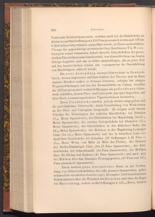 Town'sche Holzbrückensystem, welches noch bei der Ruhrbrücke zu Altstaven mit fünf Oeffnungen à 100 Fuss preussisch weiten und 12Fuss 8 Zoll hohen Gitterwänden ausgeführt wurde, in Eisen nachzubilden. Wie uns der gegenwärtige preussische Ober- Baudirector T h. Weiss haupt in seiner bekannten Arbeit über die Gitterbrücken der preussischen Eisenbahnen auseinandersetzt, war dieses Streben vom besten Erfolge begleitet und um so höher anzuschlagen, als zu jener Zeit auf den hannövrischen Linien nur vorzugsweise die Durchbildung von Blechträgern cultivirt wurde.