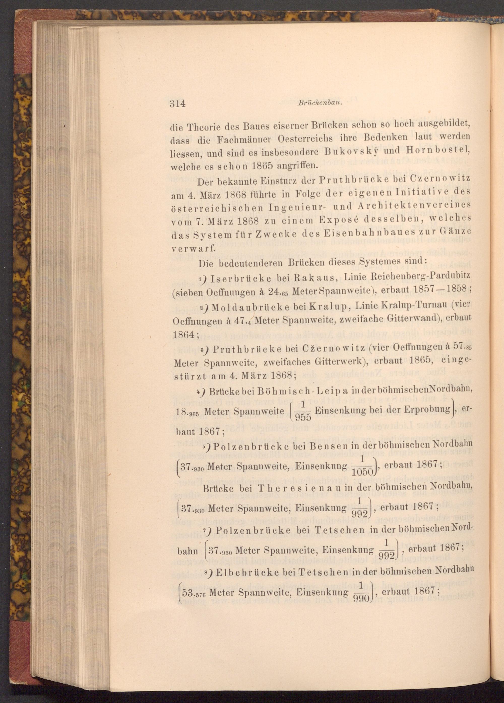 1) Iserbrücke bei Rakaus, Linie Reichenberg- Pardubitz ( sieben Oeffnungen à 24.65 Meter Spannweite), erbaut 1857-1858; 2) Moldaubrücke bei Kralup, Linie Kralup- Turnau( vier Oeffnungen à 47.4 Meter Spannweite, zweifache Gitterwand), erbaut 1864; don 1925il