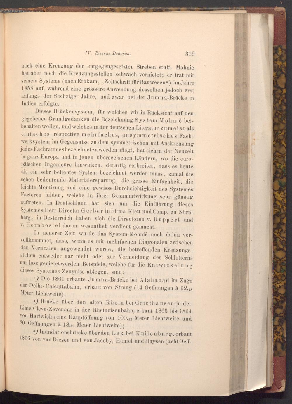 Dieses Brückensystem, für welches wir in Rücksicht auf den gegebenen Grundgedanken die Bezeichnung System Mohnié beibehalten wollen, und welches in der deutschen Literatur zumeist als einfaches, respective mehrfaches, unsymmetrisches Fachwerksystem im Gegensatze zu dem symmetrischen mit Auskreuzung jedes Fachraumes bezeichnet zu werden pflegt, hat sich in der Neuzeit in ganz Europa und in jenen überseeischen Ländern, wo die europäischen Ingenieure hinwirken, derartig verbreitet, dass es heute als ein sehr beliebtes System bezeichnet werden muss, zumal die schon bedeutende Materialersparung, die grosse Einfachheit, die leichte Montirung und eine gewisse Durchsichtigkeit des Systemes Factoren bilden, welche in ihrer Gesammtwirkung sehr günstig auftreten. In Deutschland hat sich um die Einführung dieses Systemes Herr Director Gerber in Firma Klett und Comp. zu Nürnberg, in Oesterreich haben sich die Directoren v. Ruppert und v. Hornbostel darum wesentlich verdient gemacht.