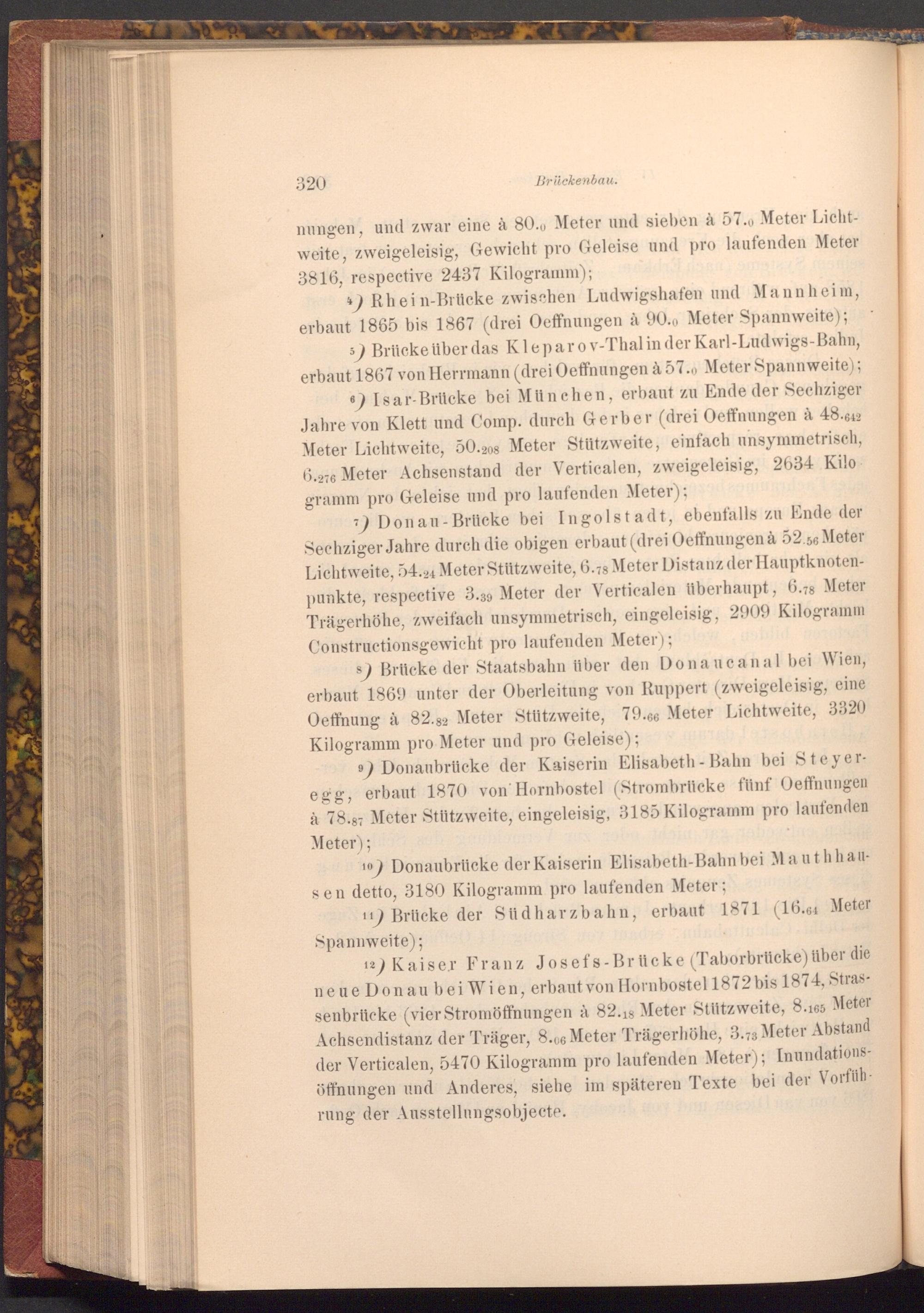 12) Kaiser Franz Josefs- Brücke( Taborbrücke) über die neue Donau bei Wien, erbaut von Hornbostel 1872 bis 1874, Strassenbrücke( vier Stromöffnungen à 82.18 Meter Stützweite, 8.165 Meter Achsendistanz der Träger, 8.06 Meter Trägerhöhe, 3.73 Meter Abstand der Verticalen, 5470 Kilogramm pro laufenden Meter); Inundationsöffnungen und Anderes, siehe im späteren Texte bei der Vorfüh rung der Ausstellungsobjecte.