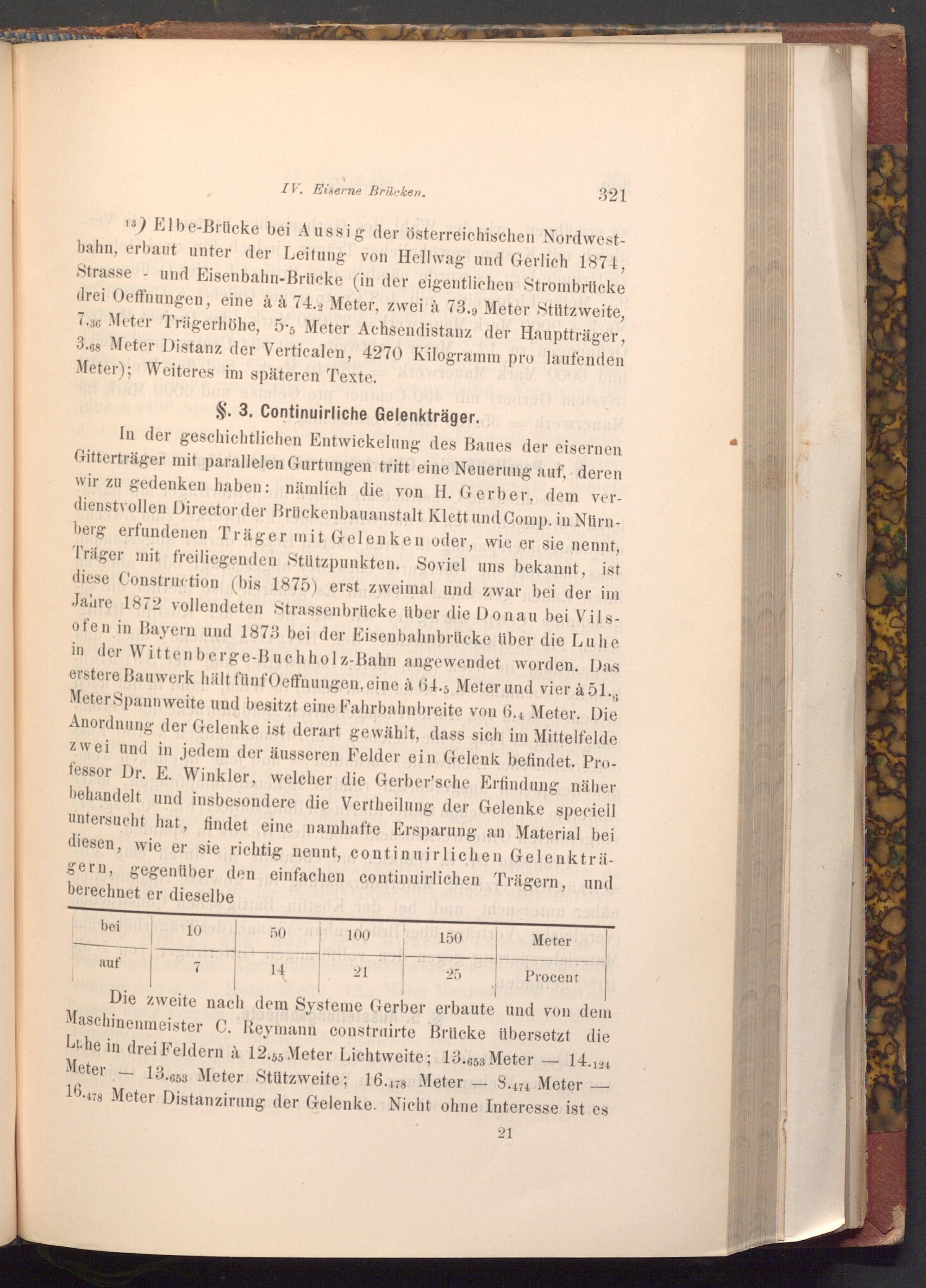 In der geschichtlichen Entwickelung des Baues der eisernen Gitterträger mit parallelen Gurtungen tritt eine Neuerung auf, deren wir zu gedenken haben: nämlich die von H. Gerber, dem verdienstvollen Director der Brückenbauanstalt Klett und Comp. in Nürnberg erfundenen Träger mit Gelenken oder, wie er sie nennt, Träger mit freiliegenden Stützpunkten. Soviel uns bekannt, ist diese Construction( bis 1875) erst zweimal und zwar bei der im Jaare 1872 vollendeten Strassenbrücke über die Donau bei Vilsofen in Bayern und 1873 bei der Eisenbahnbrücke über die Luhe in der Wittenberge- Buchholz- Bahn angewendet worden. Das erstere Bauwerk hält fünf Oeffnungen, eine à 64.5 Meter und vier à 51., Meter Spannweite und besitzt eine Fahrbahnbreite von 6.4 Meter. Die Anordnung der Gelenke ist derart gewählt, dass sich im Mittelfelde zwei und in jedem der äusseren Felder ein Gelenk befindet. Professor Dr. E. Winkler, welcher die Gerber'sche Erfindung näher behandelt und insbesondere die Vertheilung der Gelenke speciell untersucht hat, findet eine namhafte Ersparung an Material bei diesen, wie er sie richtig nennt, continuirlichen Gelenkträgern, gegenüber den einfachen continuirlichen Trägern, und berechnet er dieselbe