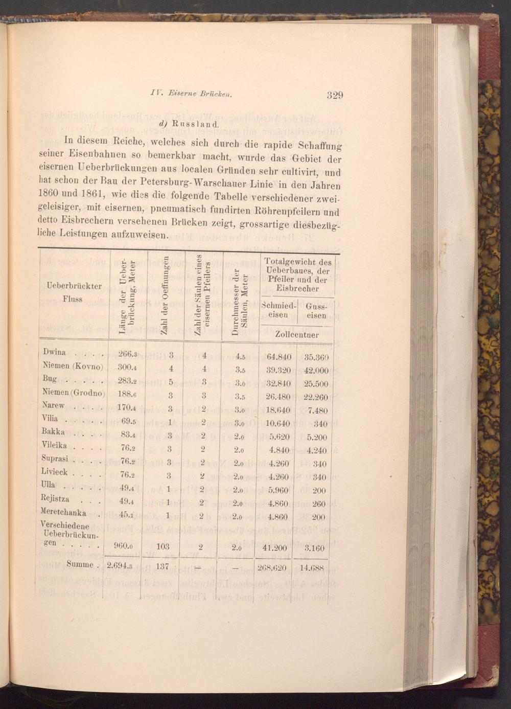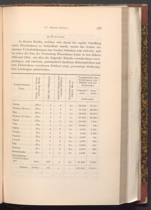 In diesem Reiche, welches sich durch die rapide Schaffung seiner Eisenbahnen so bemerkbar macht, wurde das Gebiet der eisernen Ueberbrückungen aus localen Gründen sehr cultivirt, und hat schon der Bau der Petersburg- Warschauer Linie in den Jahren 1860 und 1861, wie dies die folgende Tabelle verschiedener zweigeleisiger, mit eisernen, pneumatisch fundirten Röhrenpfeilern und detto Eisbrechern versehenen Brücken zeigt, grossartige diesbezügliche Leistungen aufzuweisen. I