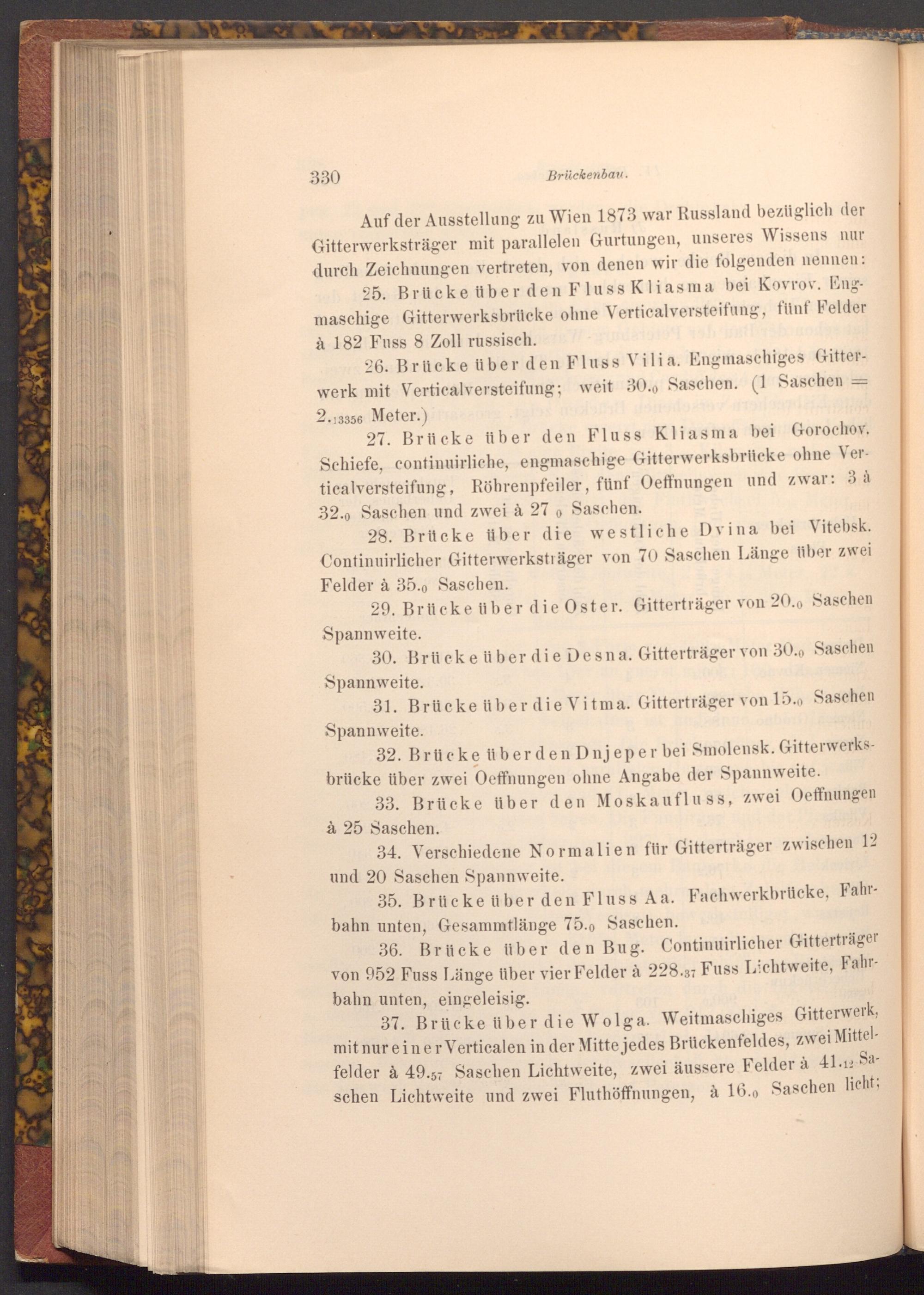 Auf der Ausstellung zu Wien 1873 war Russland bezüglich der Gitterwerksträger mit parallelen Gurtungen, unseres Wissens nur durch Zeichnungen vertreten, von denen wir die folgenden nennen: 25. Brücke über den Fluss Kliasma bei Kovrov. Eng. maschige Gitterwerksbrücke ohne Verticalversteifung, fünf Felder à 182 Fuss 8 Zoll russisch.- guda ash th