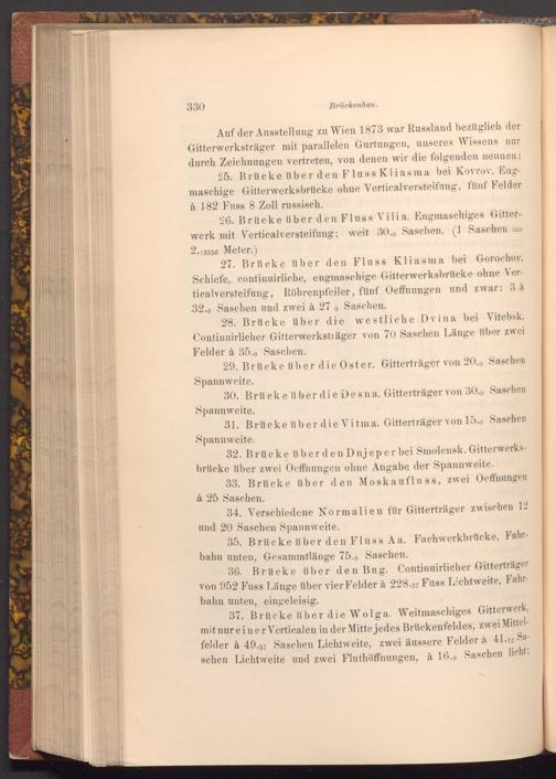 37. Brücke über die Wolga. Weitmaschiges Gitterwerk, mit nur einer Verticalen in der Mitte jedes Brückenfeldes, zwei Mittelfelder à 49.57 Saschen Lichtweite, zwei äussere Felder à 41.12 Saschen Lichtweite und zwei Fluthöffnungen, à 16., Saschen licht;
