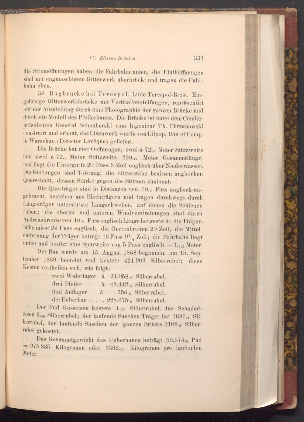 Das Gesammtgewicht des Ueberbaues beträgt 59.574., Pud 975.835 Kilogramm oder 3362.63 Kilogramm pro laufenden