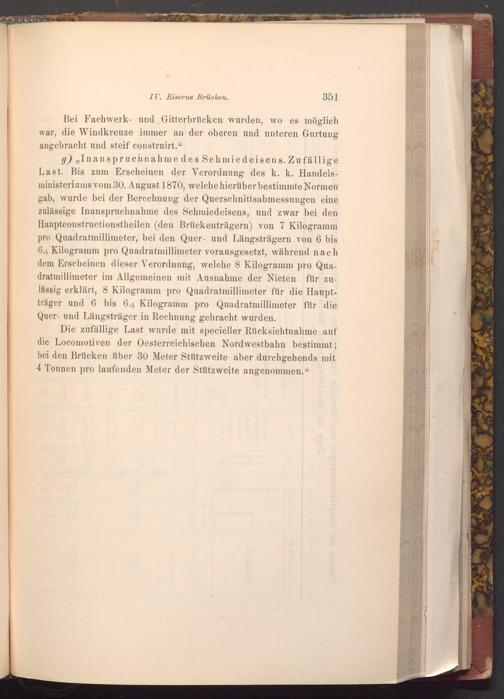 g) ,, Inanspruchnahme des Schmiedeisens. Zufällige Last. Bis zum Erscheinen der Verordnung des k. k. Handelsministeriums vom 30. August 1870, welche hierüber bestimmte Normen gab, wurde bei der Berechnung der Querschnittsabmessungen eine zulässige Inanspruchnahme des Schmiedeisens, und zwar bei den Hauptconstructionstheilen( den Brückenträgern) von 7 Kilogramm pro Quadratmillimeter, bei den Quer- und Längsträgern von 6 bis 6.5 Kilogramm pro Quadratmillimeter vorausgesetzt, während nach dem Erscheinen dieser Verordnung, welche 8 Kilogramm pro Quadratmillimeter im Allgemeinen mit Ausnahme der Nieten für zulässig erklärt, 8 Kilogramm pro Quadratmillimeter für die Hauptträger und 6 bis 6.5 Kilogramm pro Quadratmillimeter für die Quer- und Längsträger in Rechnung gebracht wurden.