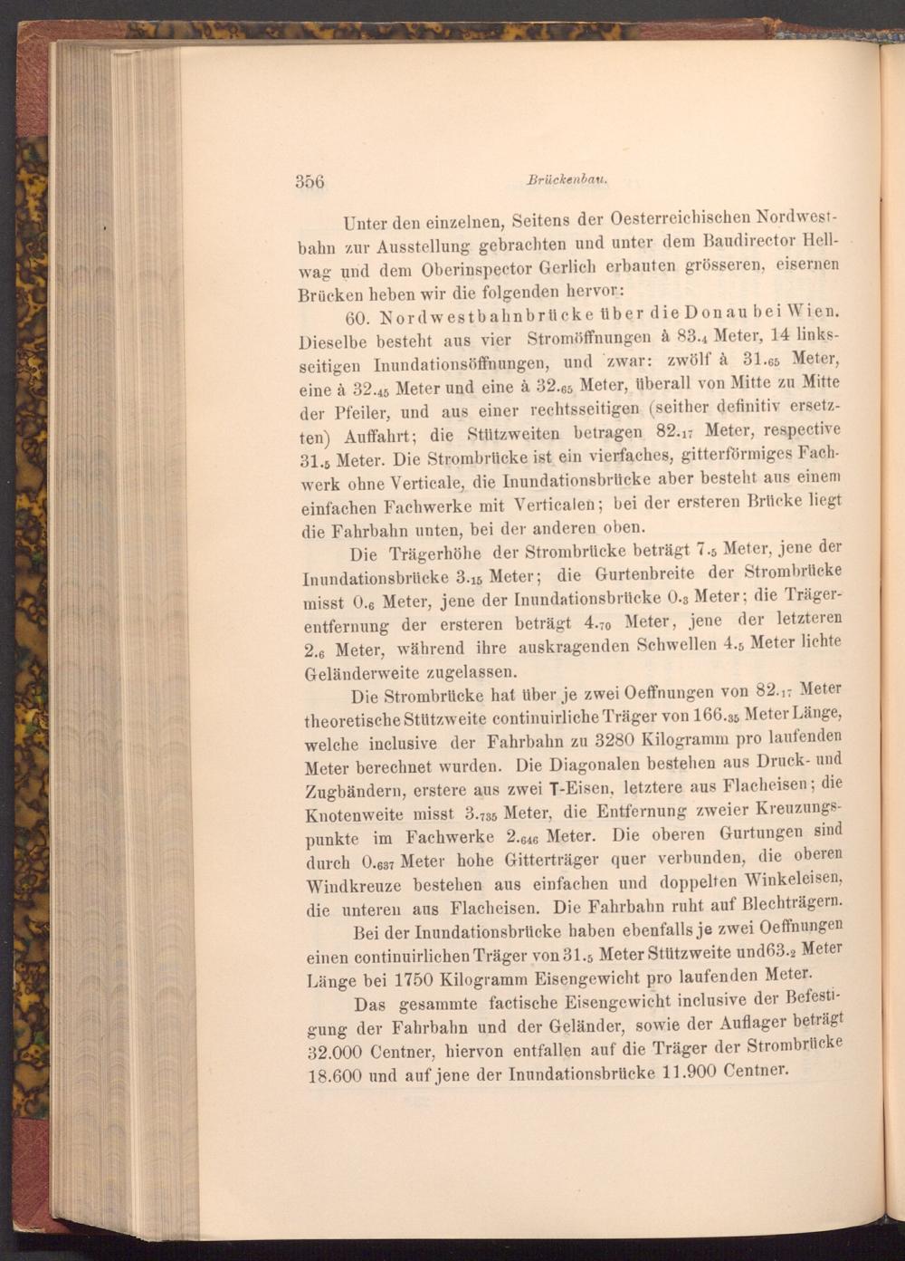 60. Nordwestbahnbrücke über die Donau bei Wien. Dieselbe besteht aus vier Stromöffnungen à 83.4 Meter, 14 linksseitigen Inundationsöffnungen, und zwar: zwölf à 31.65 Meter, eine à 32.45 Meter und eine à 32.65 Meter, überall von Mitte zu Mitte der Pfeiler, und aus einer rechtsseitigen( seither definitiv ersetzten) Auffahrt; die Stützweiten betragen 82.17 Meter, respective 31.5 Meter. Die Strombrücke ist ein vierfaches, gitterförmiges Fachwerk ohne Verticale, die Inundationsbrücke aber besteht aus einem einfachen Fachwerke mit Verticalen; bei der ersteren Brücke liegt die Fahrbahn unten, bei der anderen oben.