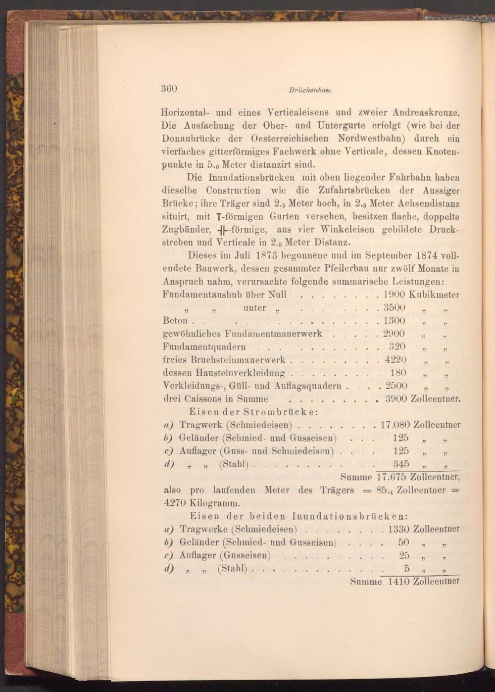 Dieses im Juli 1873 begonnene und im September 1874 vollendete Bauwerk, dessen gesammter Pfeilerbau nur zwölf Monate in Anspruch nahm, verursachte folgende summarische Leistungen: Fundamentaushub über Null