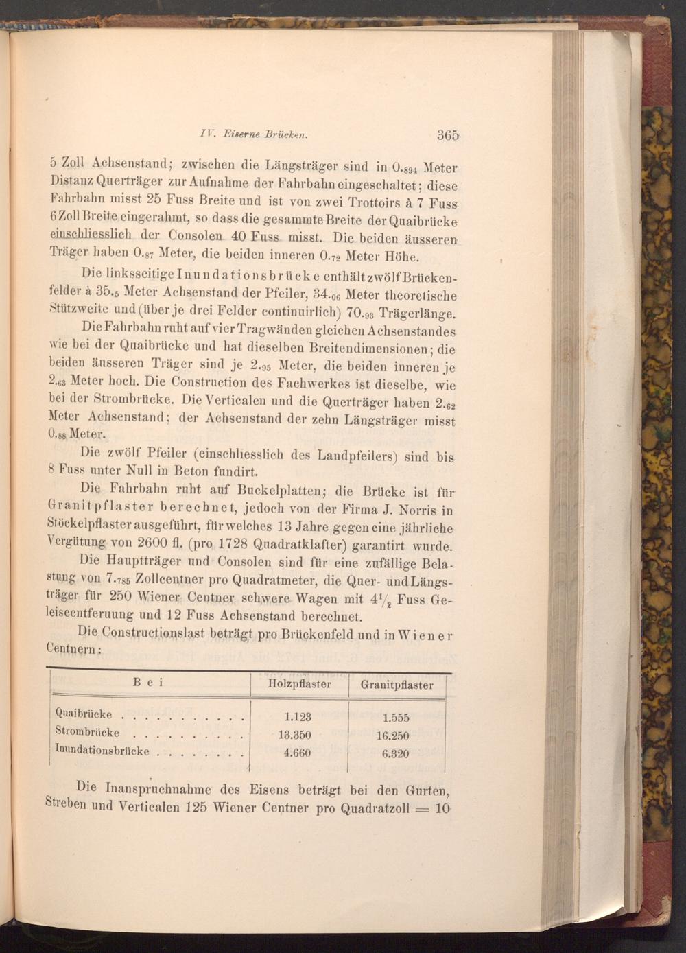 Die Hauptträger und Consolen sind für eine zufällige Belastung von 7.785 Zollcentner pro Quadratmeter, die Quer- und Längsträger für 250 Wiener Centner schwere Wagen mit 4, Fuss Geleiseentferuung und 12 Fuss Achsenstand berechnet.
