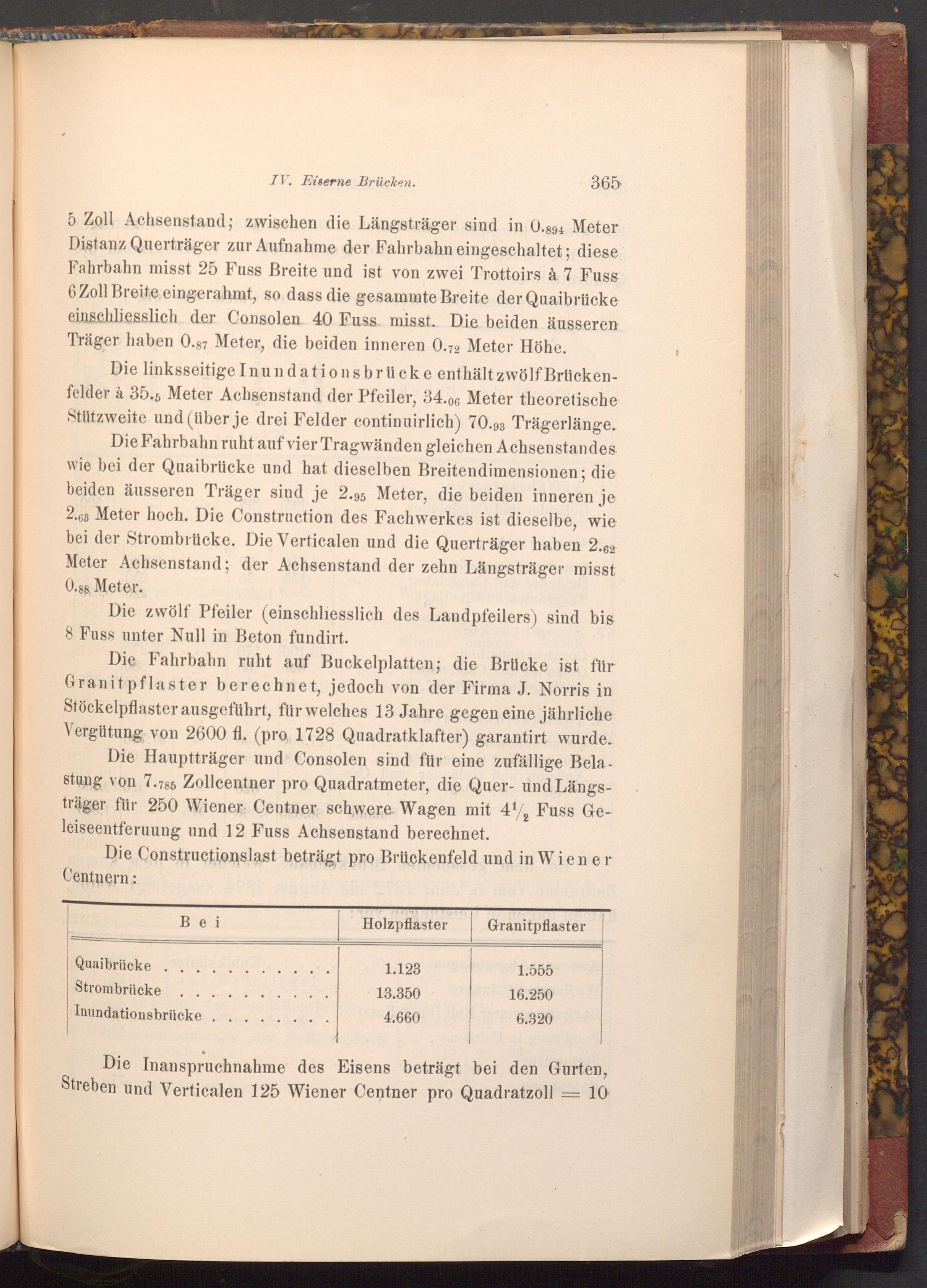 5 Zoll Achsenstand; zwischen die Längsträger sind in 0.894 Meter Distanz Querträger zur Aufnahme der Fahrbahn eingeschaltet; diese Fahrbahn misst 25 Fuss Breite und ist von zwei Trottoirs à 7 Fuss 6 Zoll Breite eingerahmt, so dass die gesammte Breite der Quaibrücke einschliesslich der Consolen 40 Fuss misst. Die beiden äusseren Träger haben 0.87 Meter, die beiden inneren 0.72 Meter Höhe.