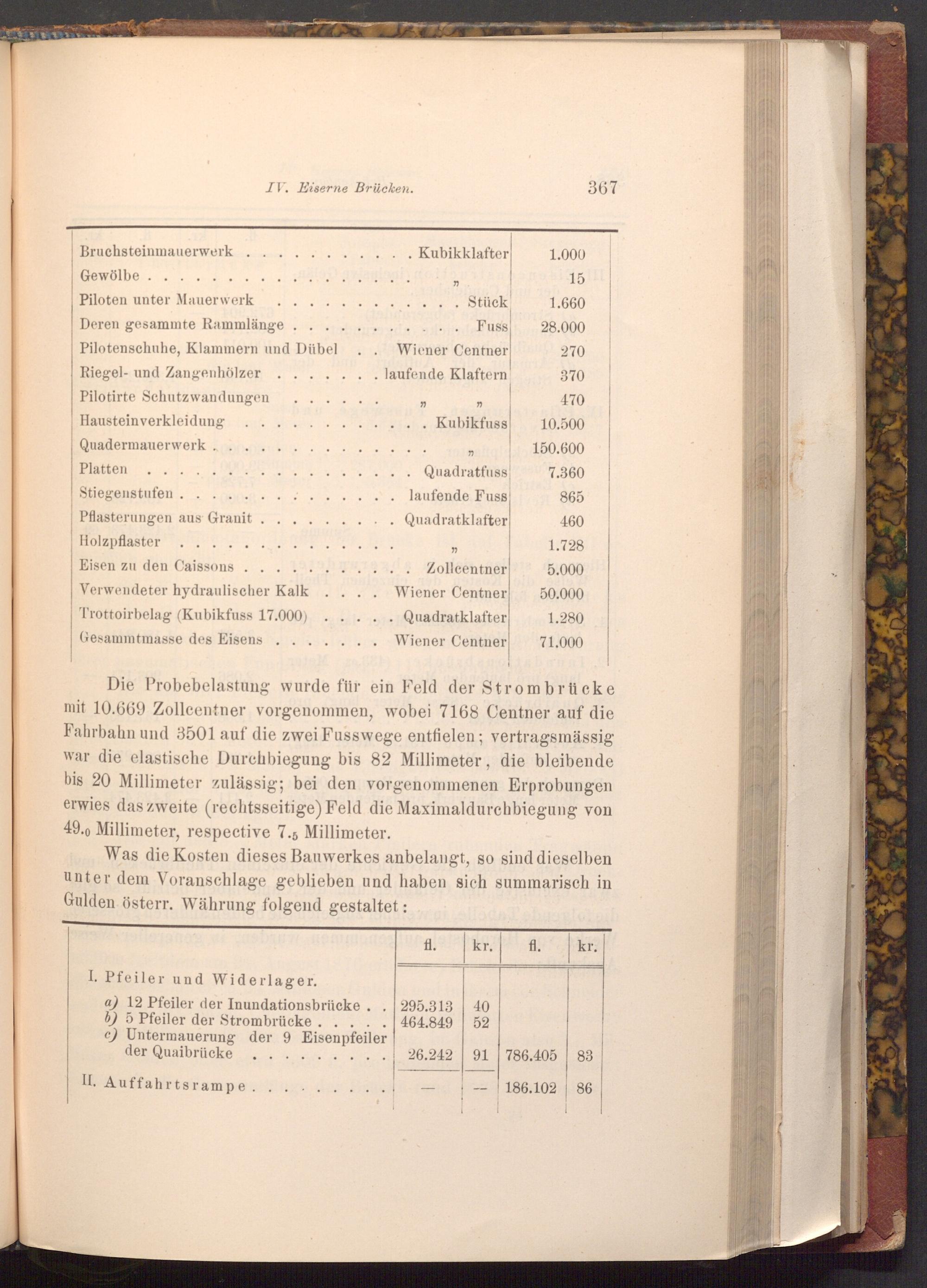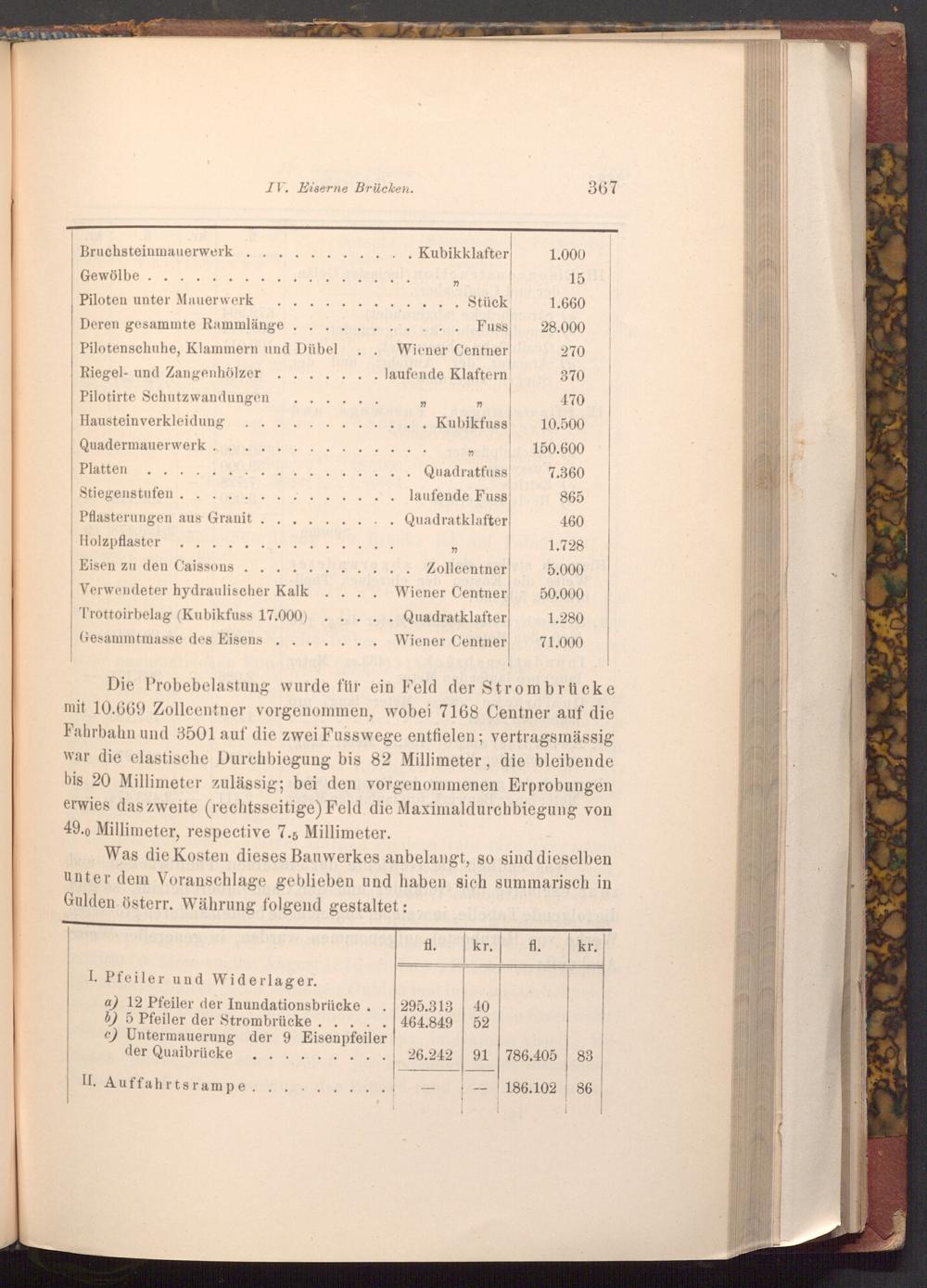 Die Probebelastung wurde für ein Feld der Strombrücke mit 10.669 Zollcentner vorgenommen, wobei 7168 Centner auf die Fahrbahn und 3501 auf die zwei Fusswege entfielen; vertragsmässig war die elastische Durchbiegung bis 82 Millimeter, die bleibende bis 20 Millimeter zulässig; bei den vorgenommenen Erprobungen erwies das zweite( rechtsseitige) Feld die Maximaldurchbiegung von 49.0 Millimeter, respective 7.5 Millimeter.