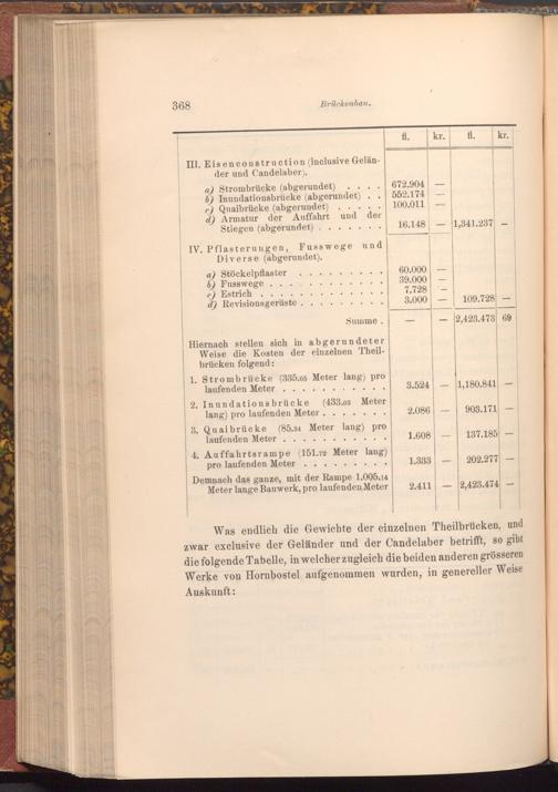 Was endlich die Gewichte der einzelnen Theilbrücken, und zwar exclusive der Geländer und der Candelaber betrifft, so gibt die folgende Tabelle, in welcher zugleich die beiden anderen grösseren Werke von Hornbostel aufgenommen wurden, in genereller Weise Auskunft: