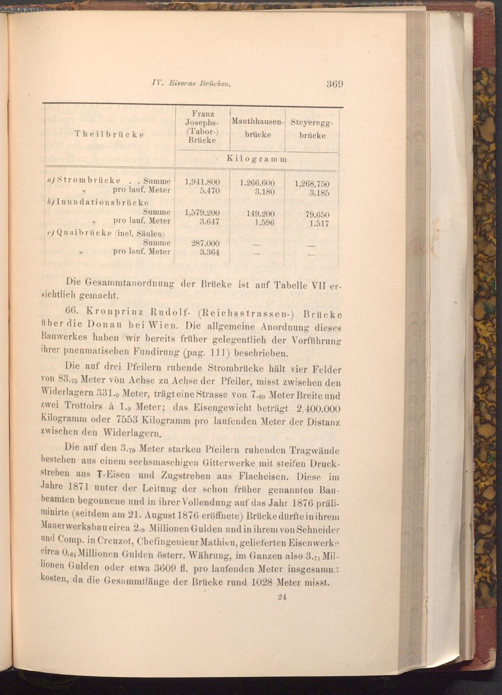 Die auf den 3.79 Meter starken Pfeilern ruhenden Tragwände bestehen aus einem sechsmaschigen Gitterwerke mit steifen Druckstreben aus T- Eisen und Zugstreben aus Flacheisen. Diese im Jahre 1871 unter der Leitung der schon früher genannten Baubeamten begonnene und in ihrer Vollendung auf das Jahr 1876 präliminirte( seitdem am 21. August 1876 eröffnete) Brücke dürfte in ihrem Mauerwerksbau circa 2., Millionen Gulden und in ihrem von Schneider und Comp. in Creuzot, Chefingenieur Mathieu, gelieferten Eisenwerke circa 0.81 Millionen Gulden österr. Währung, im Ganzen also 3.71 Millionen Gulden oder etwa 3609 fl. pro laufenden Meter insgesamm.t kosten, da die Gesammtlänge der Brücke rund 1028 Meter misst.
