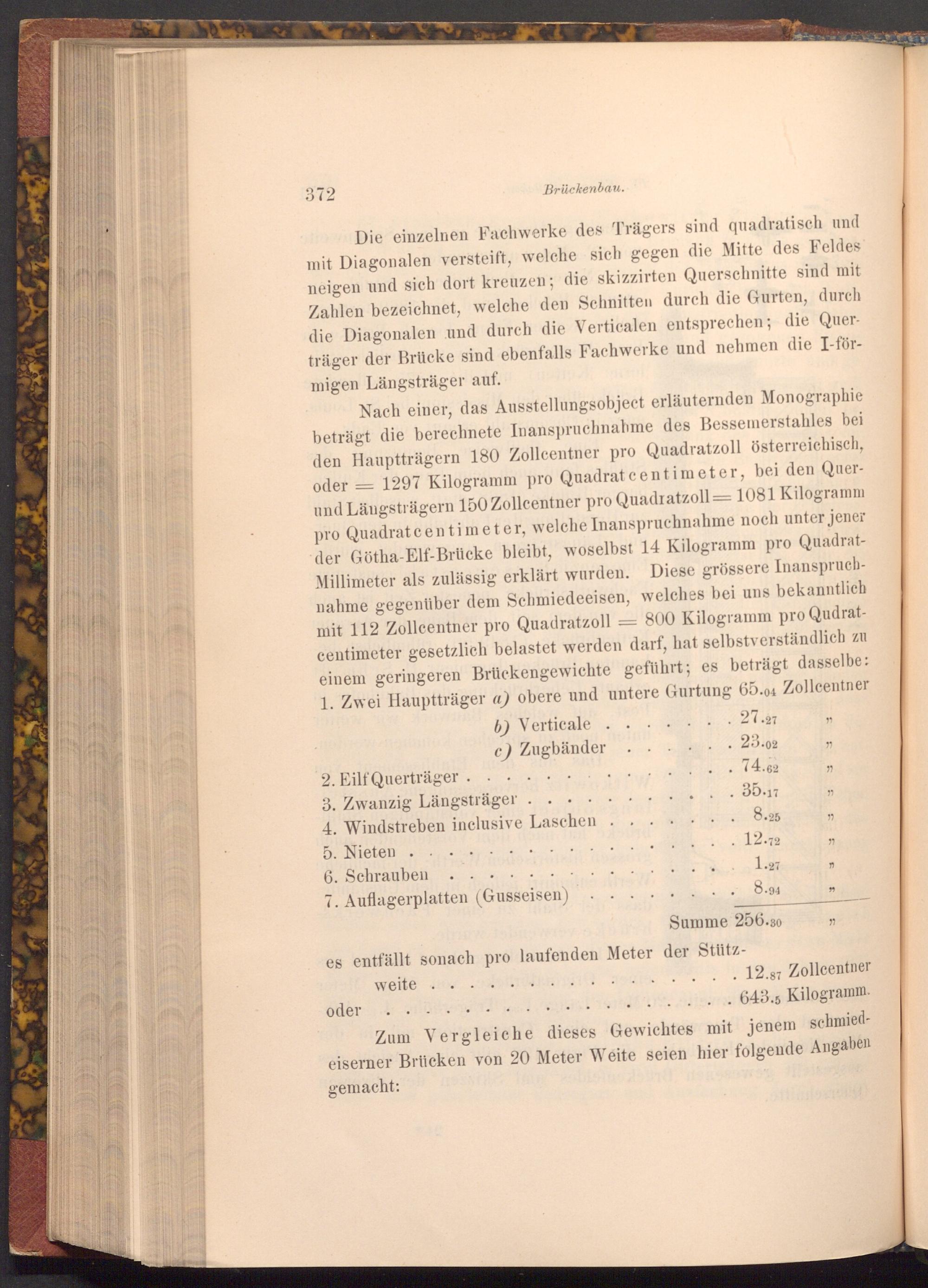 Zum Vergleiche dieses Gewichtes mit jenem schmiedeiserner Brücken von 20 Meter Weite seien hier folgende Angaben gemacht: