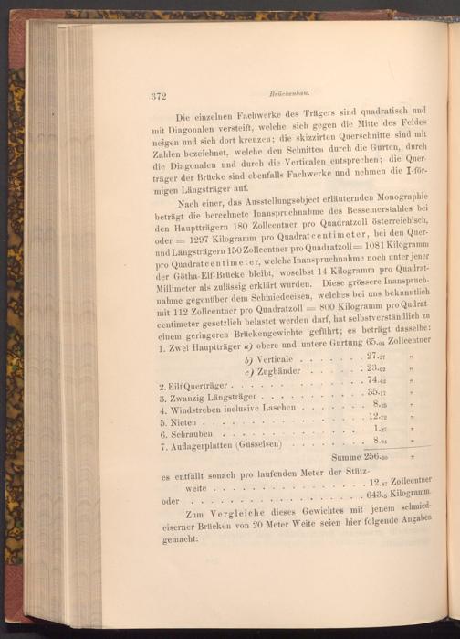 Nach einer, das Ausstellungsobject erläuternden Monographie beträgt die berechnete Inanspruchnahme des Bessemerstahles bei den Hauptträgern 180 Zollcentner pro Quadratzoll österreichisch, oder 1297 Kilogramm pro Quadrat centimeter, bei den Querund Längsträgern 150 Zollcentner pro Quadratzoll= 1081 Kilogramm pro Quadrat centimeter, welche Inanspruchnahme noch unter jener der Götha- Elf- Brücke bleibt, woselbst 14 Kilogramm pro QuadratMillimeter als zulässig erklärt wurden. Diese grössere Inanspruchnahme gegenüber dem Schmiedeeisen, welches bei uns bekanntlich 800 Kilogramm pro Qudratmit 112 Zollcentner pro Quadratzoll centimeter gesetzlich belastet werden darf, hat selbstverständlich zu einem geringeren Brückengewichte geführt; es beträgt dasselbe: 1. Zwei Hauptträger a) obere und untere Gurtung 65.04 Zollcentner
