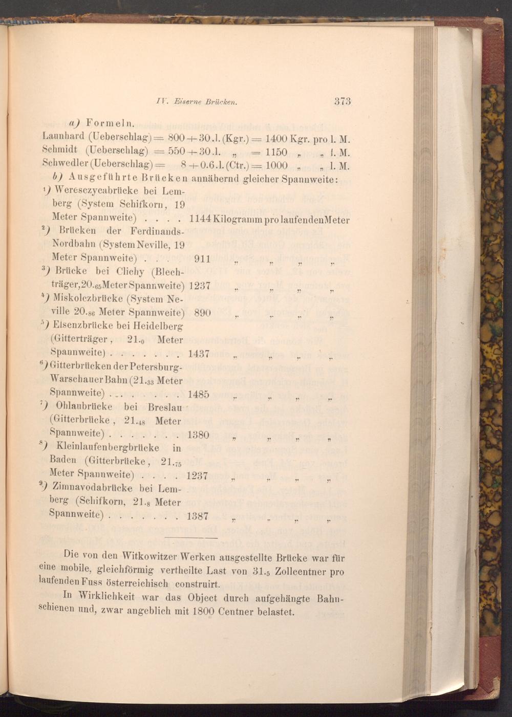Die von den Witkowitzer Werken ausgestellte Brücke war für eine mobile, gleichförmig vertheilte Last von 31.5 Zollcentner pro laufenden Fuss österreichisch construirt.