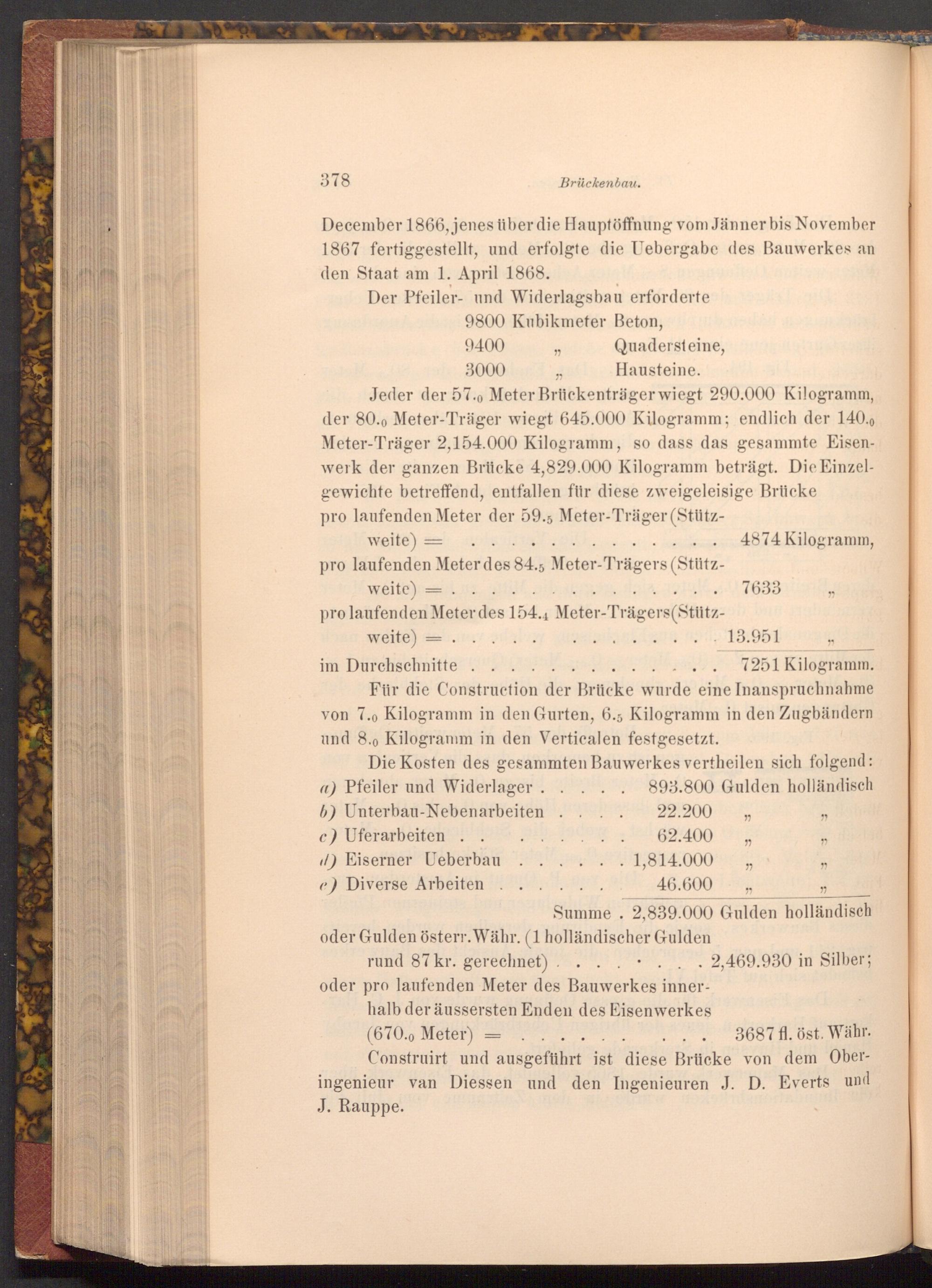 Die Kosten des gesammten Bauwerkes vertheilen sich folgend: a) Pfeiler und Widerlager. 893.800 Gulden holländisch