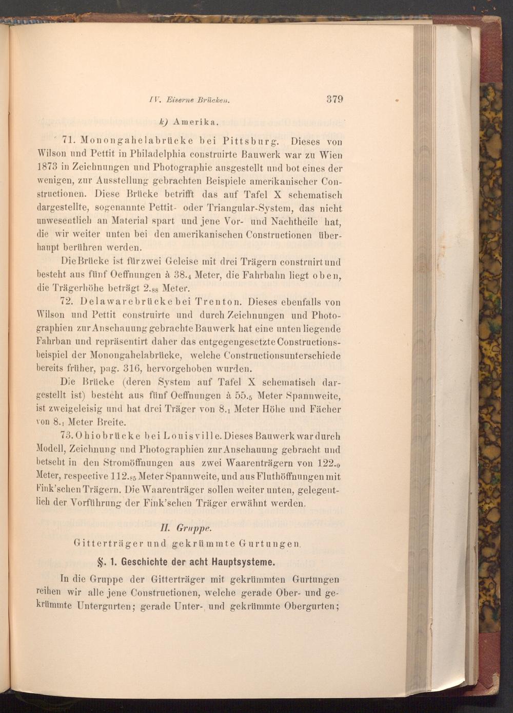 71. Monongahelabrücke bei Pittsburg. Dieses von Wilson und Pettit in Philadelphia construirte Bauwerk war zu Wien 1873 in Zeichnungen und Photographie ausgestellt und bot eines der wenigen, zur Ausstellung gebrachten Beispiele amerikanischer Constructionen. Diese Brücke betrifft das auf Tafel X schematisch dargestellte, sogenannte Pettit- oder Triangular- System, das nicht unwesentlich an Material spart und jene Vor- und Nachtheile hat, die wir weiter unten bei den amerikanischen Constructionen überhaupt berühren werden.