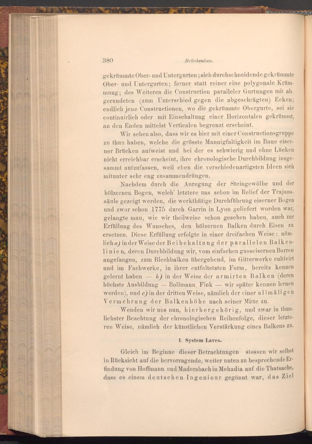 Nachdem durch die Anregung der Steingewölbe und der hölzernen Bogen, welch' letztere uns schon im Relief der Trajanssäule gezeigt werden, die werkthätige Durchführung eiserner Bogen und zwar schon 1775 durch Garrin in Lyon geliefert worden war, gelangte man, wie wir theilweise schon gesehen haben, auch zur Erfüllung des Wunsches, den hölzernen Balken durch Eisen zu ersetzen. Diese Erfüllung erfolgte in einer dreifachen Weise: nämlich a) in der Weise der Beibehaltung der parallelen Balkenlinien, deren Durchbildung wir, vom einfachen gusseisernen Barren angefangen, zum Blechbalken übergehend, im Gitterwerke cultivirt und im Fachwerke, in ihrer entfaltetsten Form, bereits kennen gelernt haben- b) in der Weise der armirten Balken( deren höchste Ausbildung Bollmann, Fink wir später kennen lernen werden), und c) in der dritten Weise, nämlich der einer allmäligen Vermehrung der Balkenhöhe nach seiner Mitte zu.