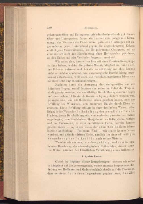 Wir sehen also, dass wir es hier mit einer Constructionsgruppe zu thun haben, welche die grösste Mannigfaltigkeit im Baue eiserner Brücken aufweist und bei der es schwierig und ohne Lücken nicht erreichbar erscheint, ihre chronologische Durchbildung insgesammt aufzufassen, weil eben die verschiedenartigsten Ideen sich mitunter sehr eng zusammendrängen.